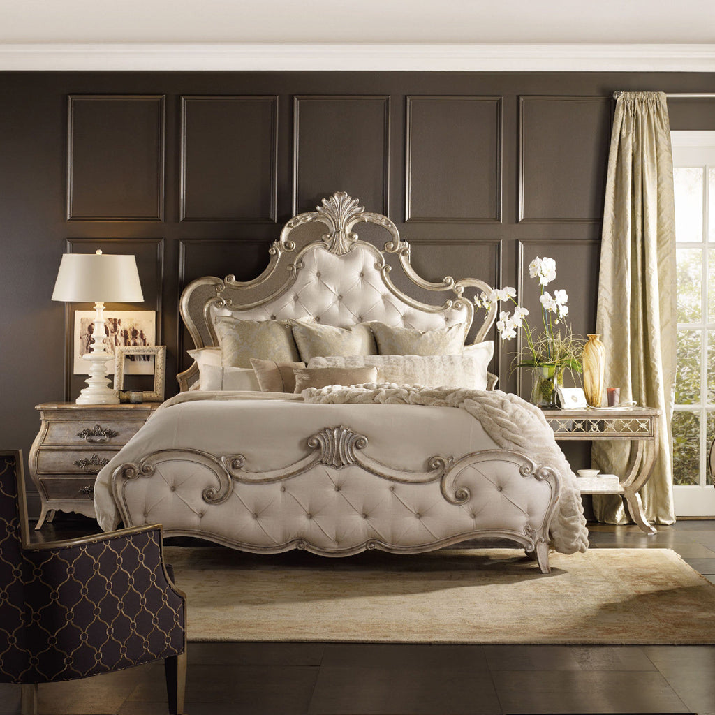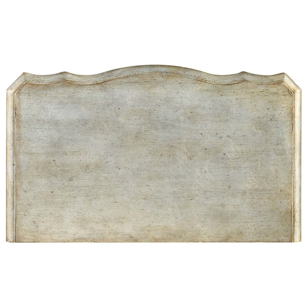 Inspired by an 18th Century French Antique, this curvy three-drawer bombe-shaped nightstand is all elegance in a silver leaf finish with slightly aged patina and opulent hardware.