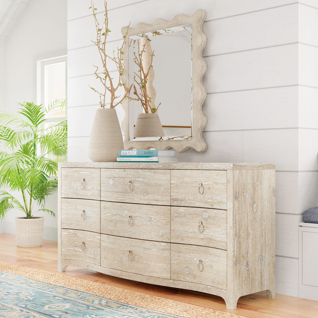 ring the relaxed aura of the outside in with the lovely scalloped-edge Bora Landscape Mirror in the refreshing Surf finish, an airy whitewashed oak with wire-brushing detail.
