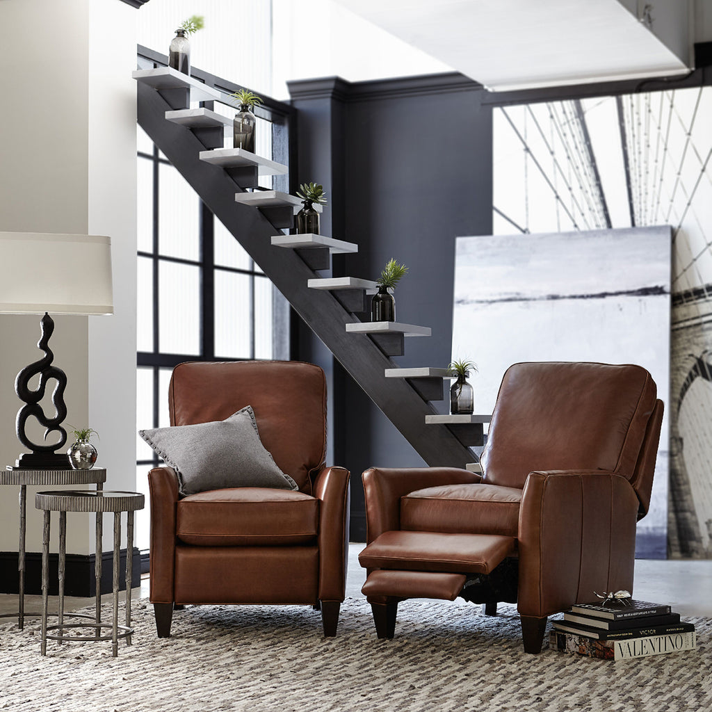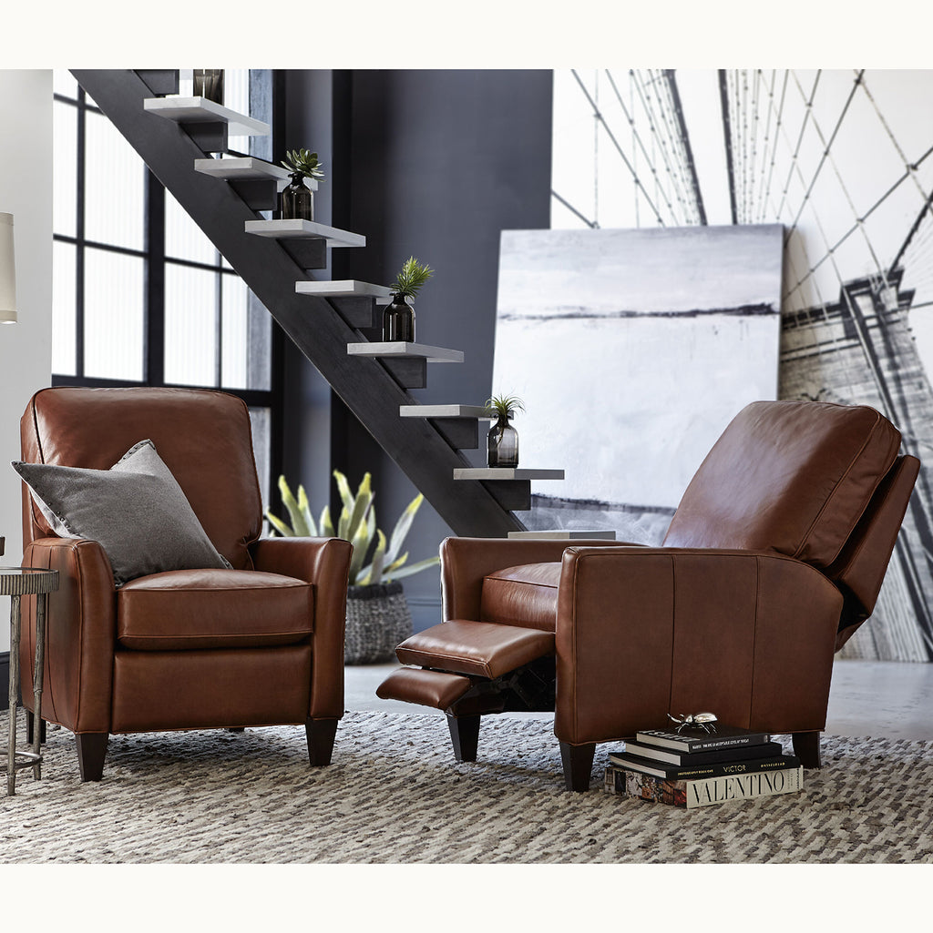 Designer-friendly scale and a plush Aniline Top Grain leather in a delightful caramel brown hue will make this recliner the favorite chair in your house. Recliner is operated manually by pushing on the arms for effortless relaxation.