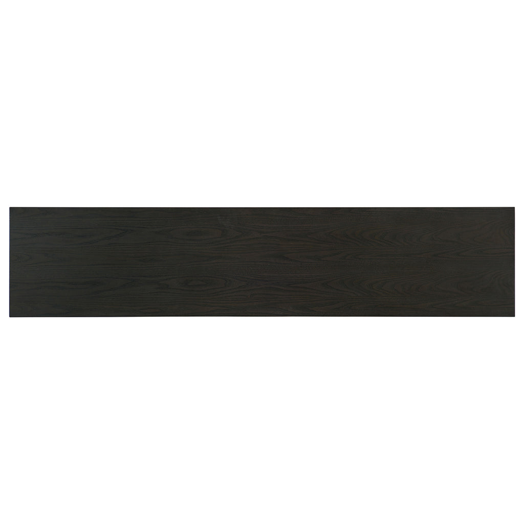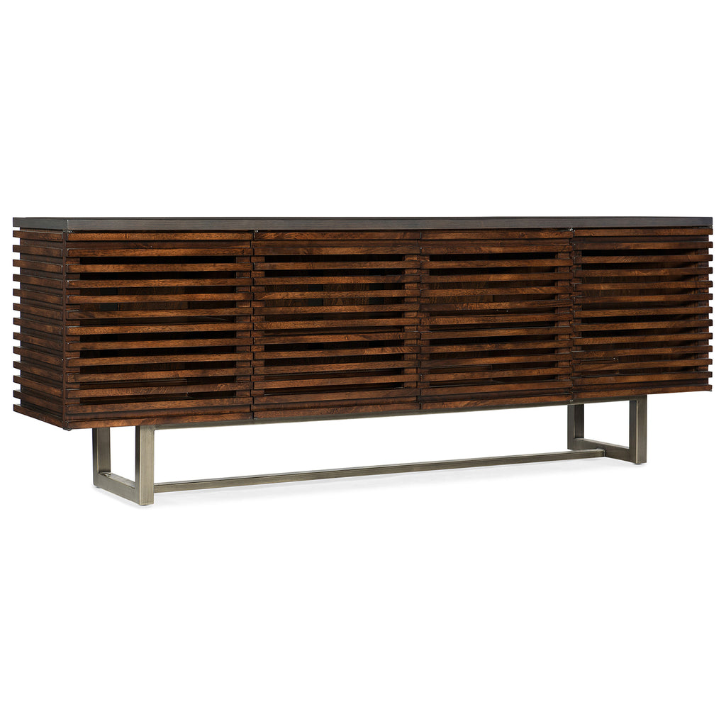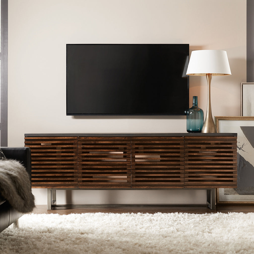 Crafted of Elm and Poplar Veneers with an antique bronze metal base, the Solstice Entertainment Center has a sophisticated primitive style. There’s one adjustable, ventilated wood shelf the center pair of doors and one adjustable ventilated wood shelf each of the outside doors and a ventilated back panel in all sections. Contrasting a medium wood finish with a dark gray top, the Solstice accommodates up to an 80-inch TV.