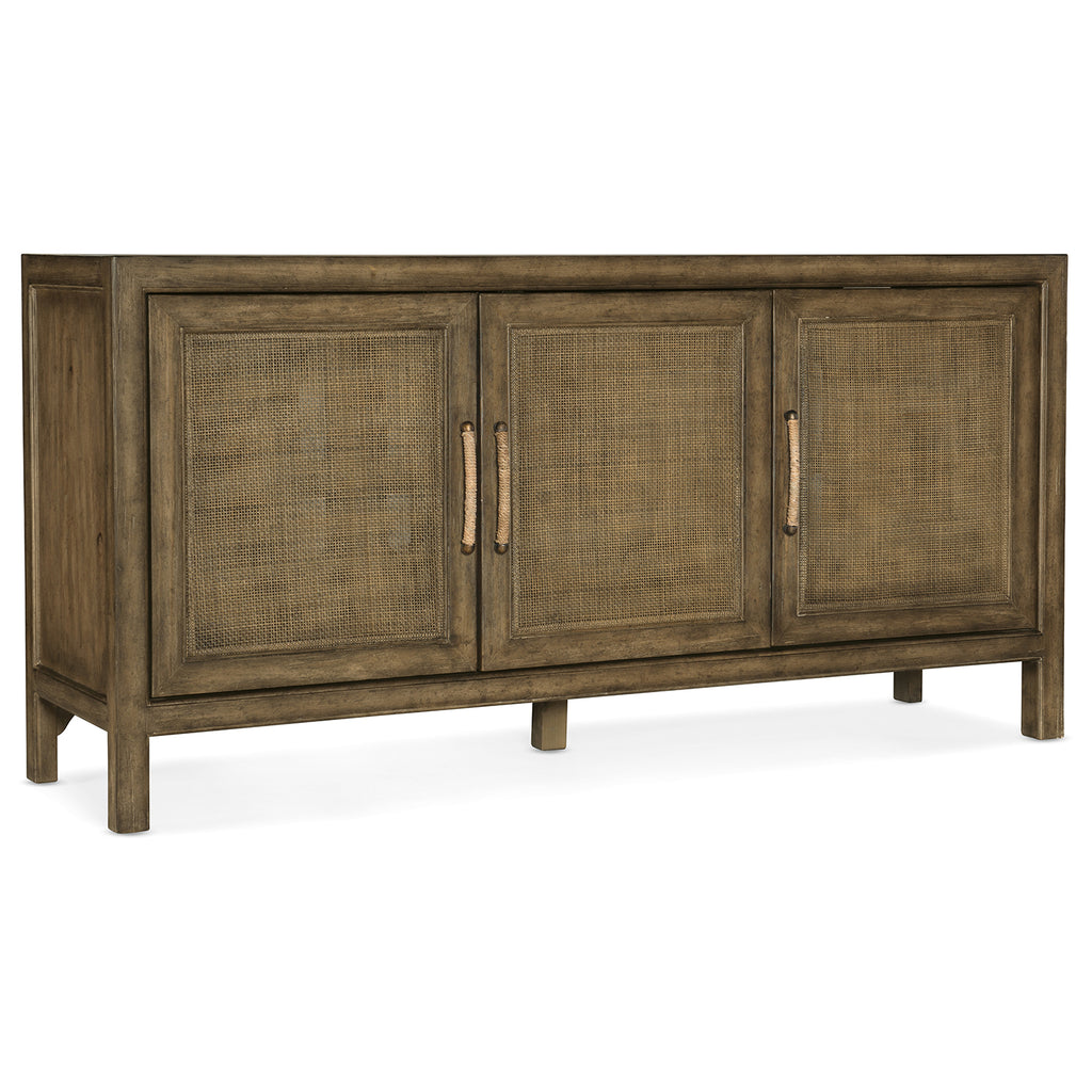 With a laid-back tropical vibe, the Sundance Media Console has three rattan-front doors with soft-close hinges and is finished in Cliffside, a rich brown with light burnishing on the edges. Crafted of Pecan Veneers and Rattan with a Solid Wood edge top, the console has one vented adjustable shelf behind the left pair of doors and one vented adjustable shelf behind the right door, a ventilated back panel and one 3-plug electrical outlet. Accommodates a 65-inch flat screen TV.