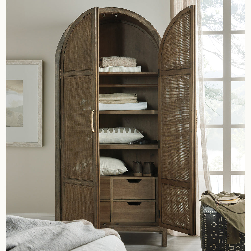 Inspired by the rugged and picturesque Malibu landscape, the Sundance Wardrobe is crafted of Pecan Veneers and Rattan, with rattan inserts on the two doors. Behind the doors are four drawers with self-closing drawer guides, one fixed shelf and two adjustable shelves, along with a removable clothing rod. Adding to the casual earthy vibe is the Cliffside finish, a rich dynamic brown with light burnishing on the edges.