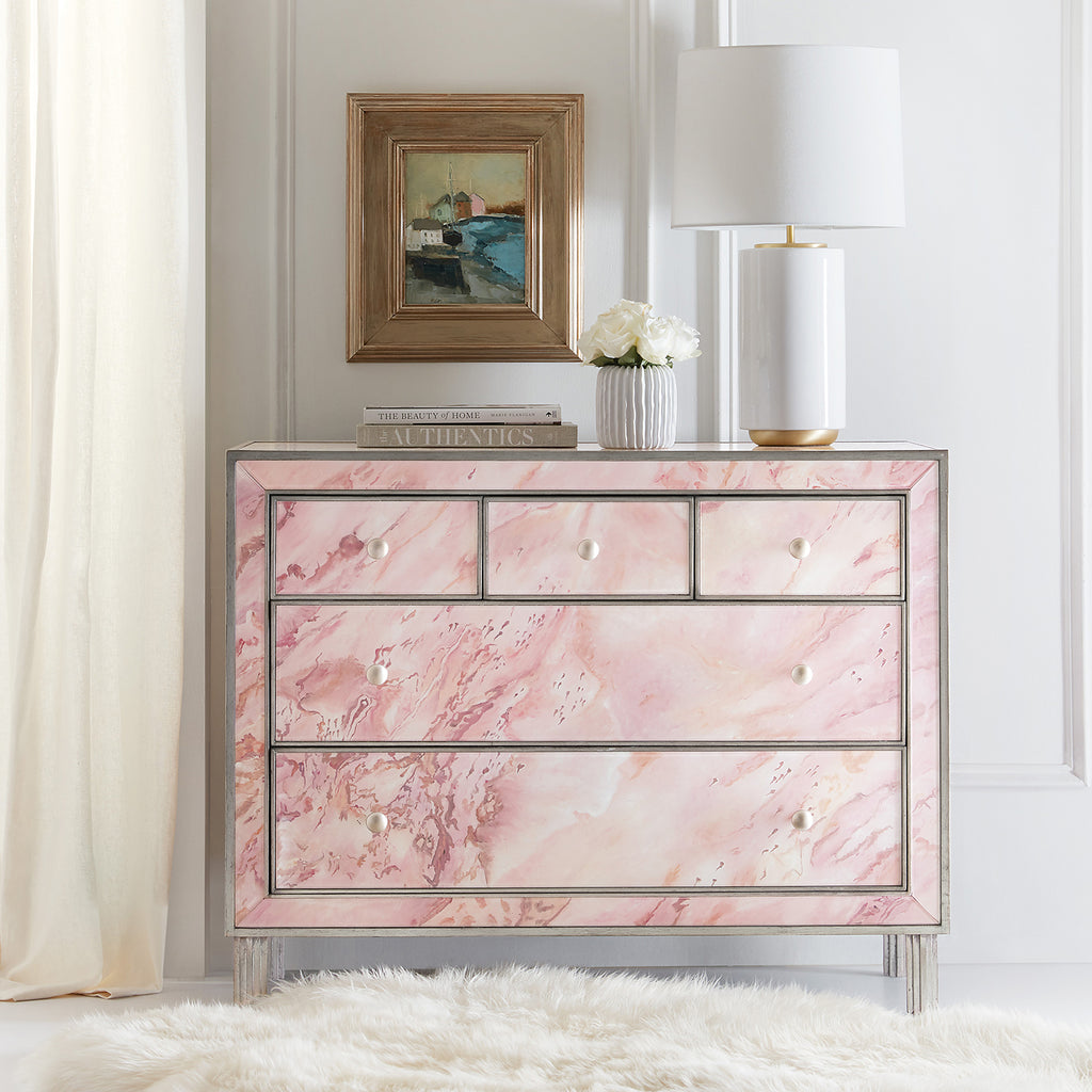 A tribute to the incredible strength and fortitude of those affected by breast cancer, the Eternal Chest features reverse painted class and watercolor-like pink hues complemented by silver accents, ribbed silver legs and silver-finished round metal knobs. The five self-closing drawers have pink interiors.