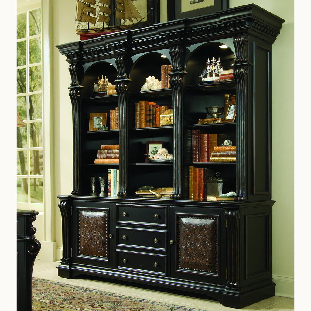 Telluride's black paint finish with reddish brown rub-through, carved leather panels and nail head trim give this collection a rich masculine look.