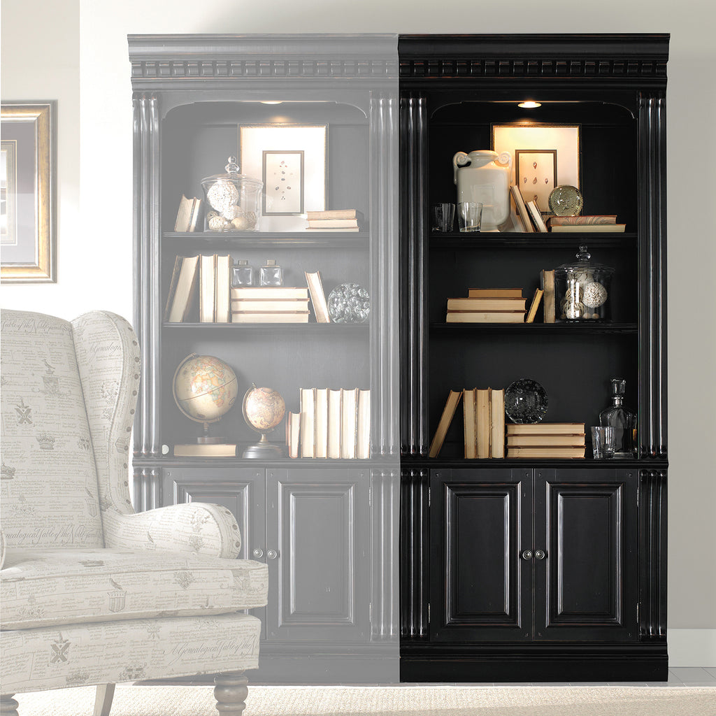 Striking and stately, the Telluride Bunching Bookcase has a black paint finish with reddish brown rub-through, exuding a rich masculine look of the English countryside. Pedigreed design details include dentil molding across the top, and column motifs down the sides of the case front. The top of the bookcase has a total of 3 exposed shelves including one adjustable wood-framed glass shelf, and there is a canister light controlled by a three-intensity touch switch. Two doors with one adjustable shelf behind. Crafted of cherry veneers.