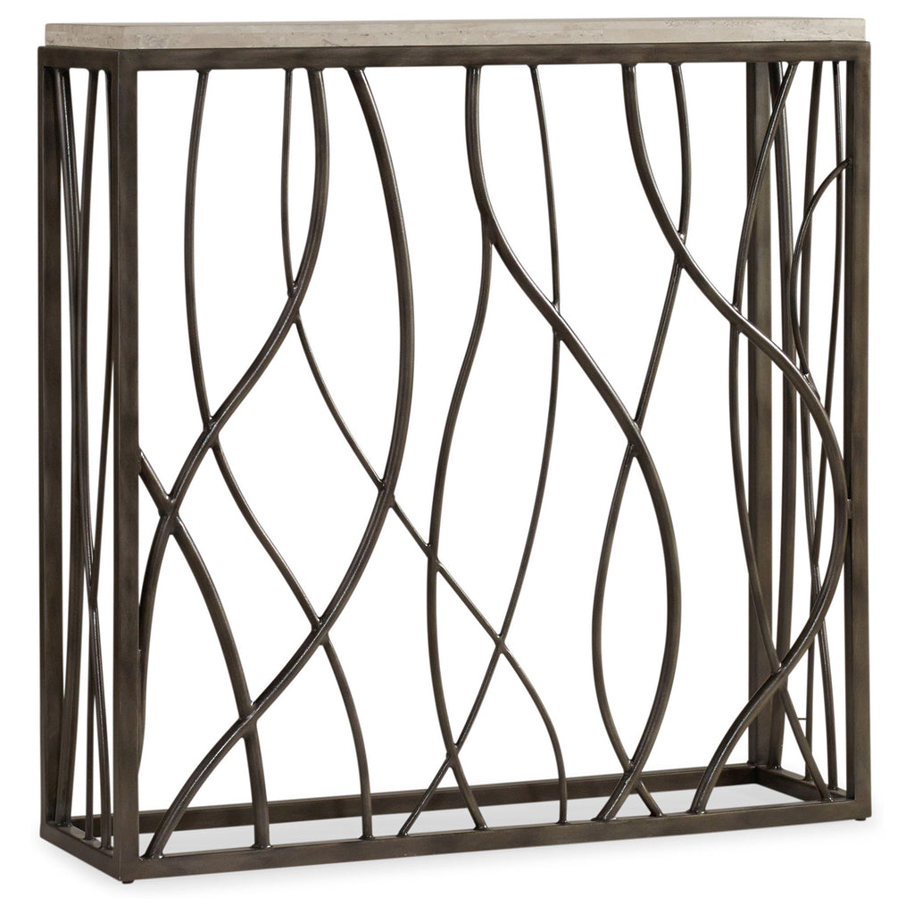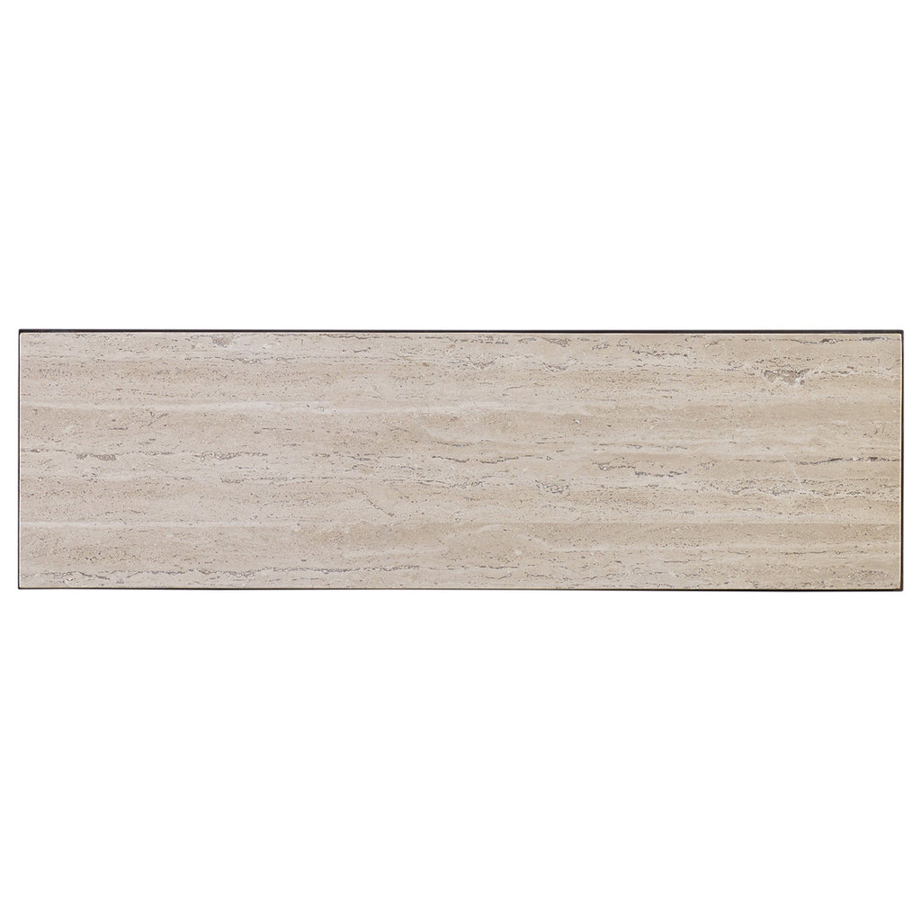 Organic and modern, this striking thin metal console in a neutral color palette has a curvy steel base and natural stone top of Travertine Marble to create an inviting focal point with a compact 40W x 12D footprint.