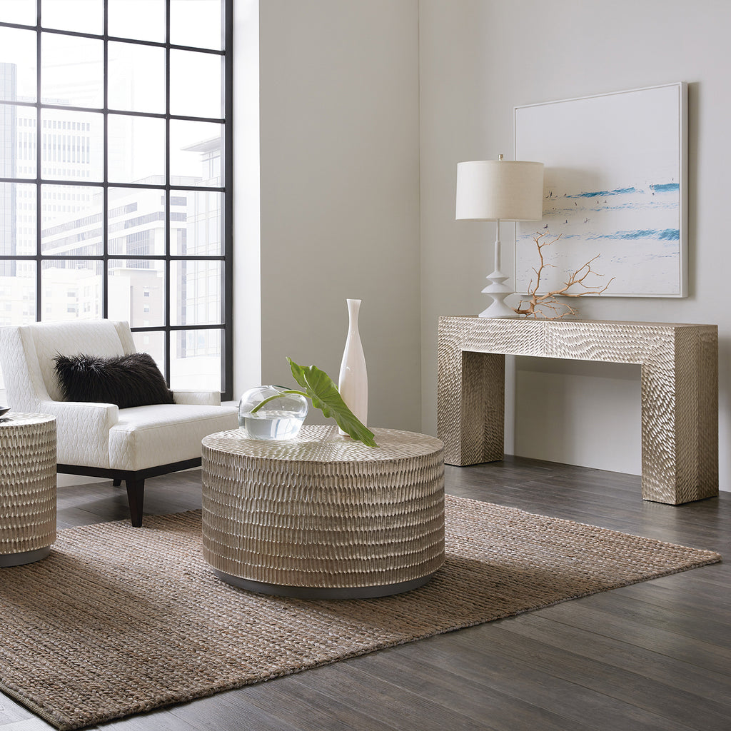 Chunky and chic with an intriguing texture and classic silhouette, the Tivoli Console Table covered in German Silver foil creates a punctuation mark of style for any space. The narrow, 14-inch depth makes it versatile for even tight spaces.