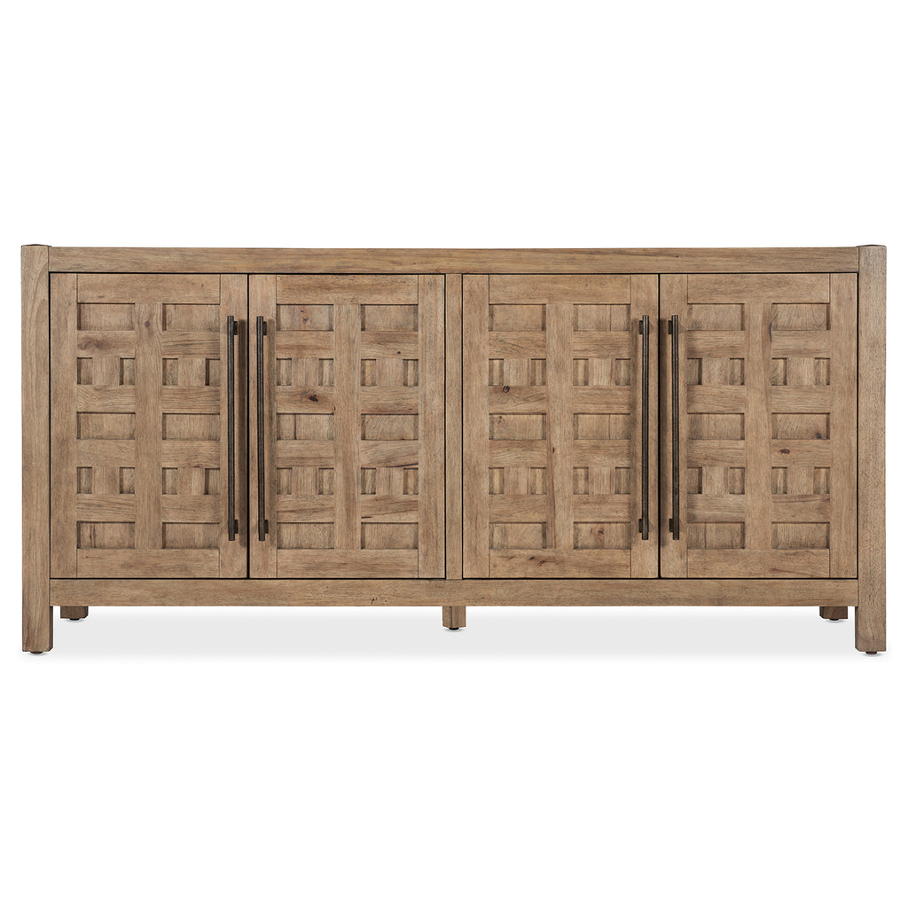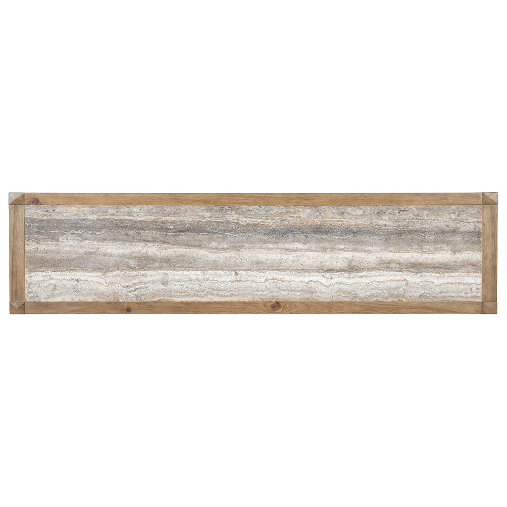 Inspired by California wine country and influenced by the quaint bungalows and craftsman architecture of the region, the Vineyard Row Buffet is made of Pecky Hickory and White Oak Veneers with a honed gray travertine insert on the top. The four doors with soft close hinges feature cutout fretwork door fronts. There’s one self-closing drawer behind each pair of doors, and the left drawer has a removable black felt silverware tray while the right drawer has a removable black felt liner. There’s one adjustable wood shelf behind each pair of doors. The light-and-airy Sonoma finish is reminiscent of the crisp white wines of the Sonoma region and complemented by hammered metal bar pulls and knobs.
