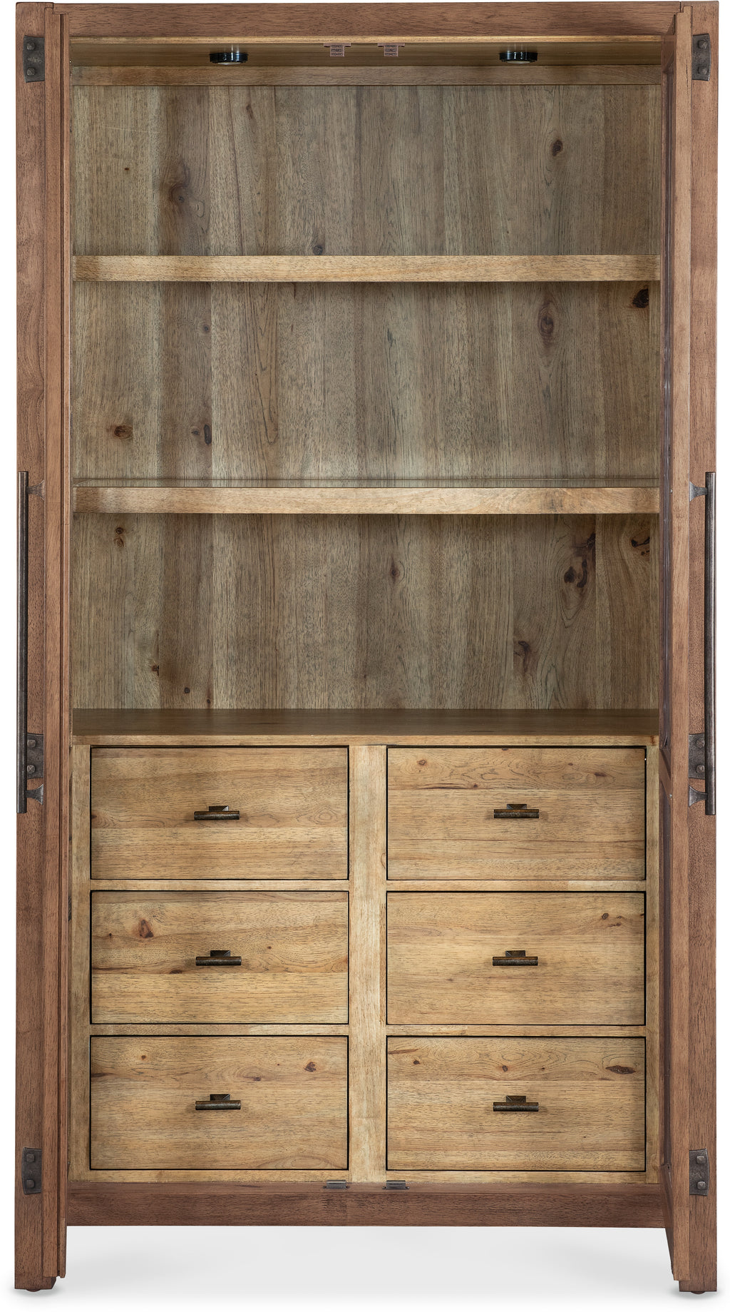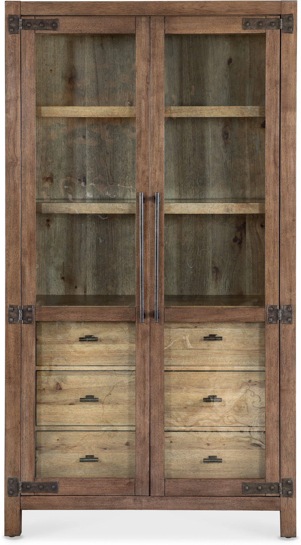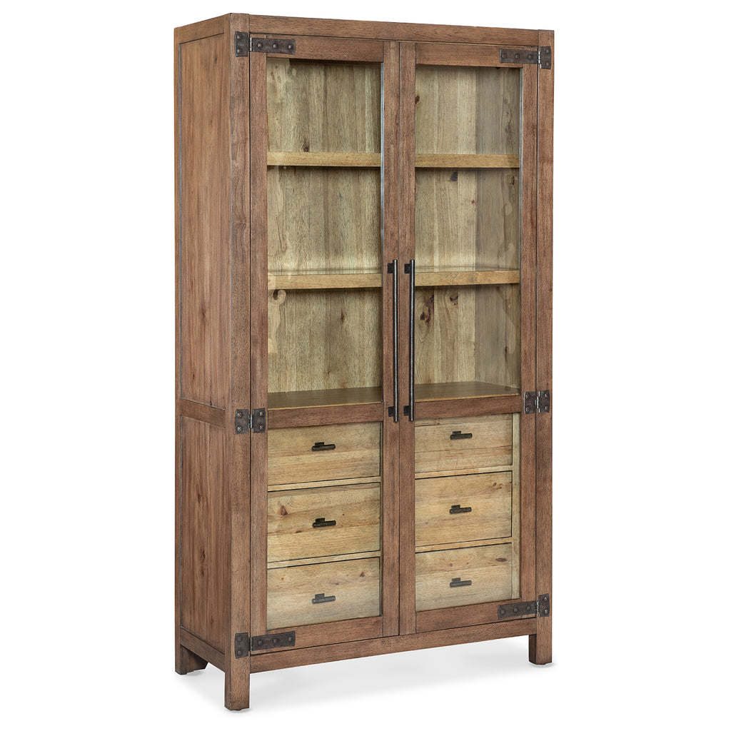 Inspired by California wine country and influenced by the quaint bungalows and craftsman architecture of the region, the Vineyard Row Display Cabinet is made of Pecky Hickory and White Oak Veneers with wood-framed seeded glass doors with rustic hammered metal hinge accents. The cabinet features a two- tone finish with the light-and-airy Sonoma on the inside and the robust Napa on the doors. Along with two self-closing drawers, there are two lights with a 3-intensity touch-switch located on the right middle hinge. The hammered metal bar pulls complement the metal hinges.