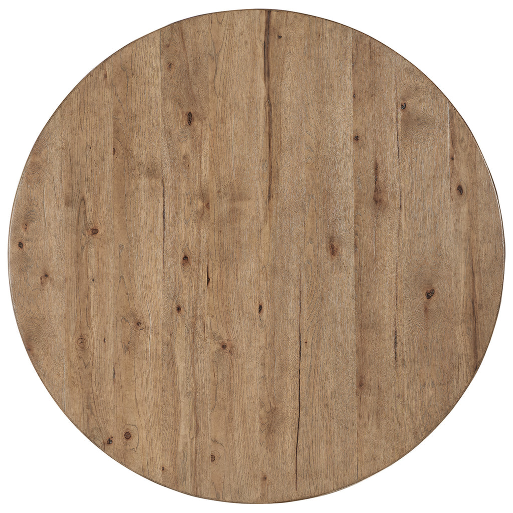 Inspired by the casual wine country lifestyle, the 62-inch-round Vineyard Row Dining Table has a wine-barrel-shaped base and a two-tone finish combining the light-and-airy Sonoma on the top and the robust Napa finish on the base, both over Pecky Hickory wood.