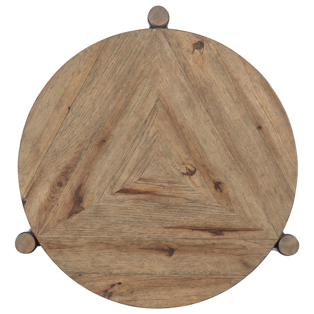 Inspired by California wine country and influenced by the quaint bungalows and craftsman architecture of the region, the 24-inch round Vineyard Row End Table is crafted of Pecky Hickory Veneers with rustic hammered metal brackets beneath the top and the base. There are three legs and one fixed shelf.