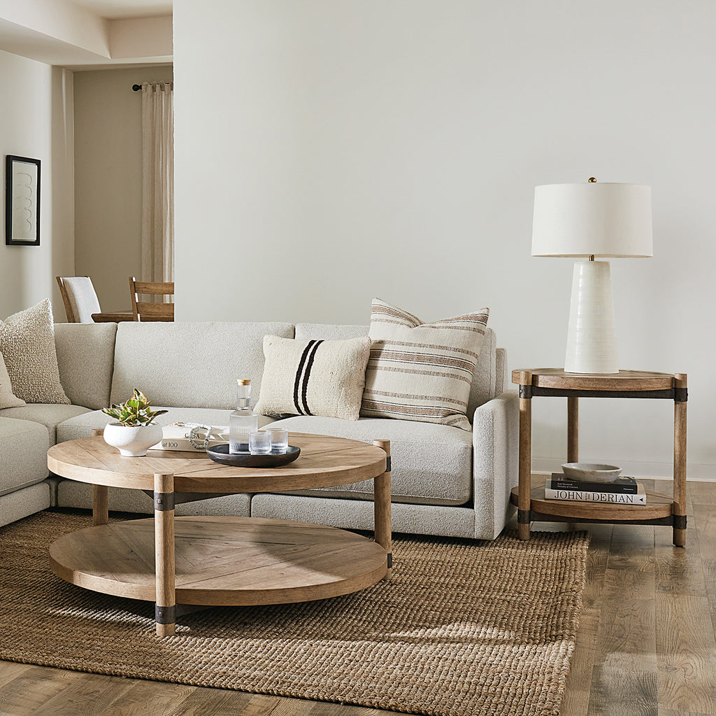 Earthy meets beachy in the 24-inch round Vineyard Row Pedestal End table, combining wood on the pedestal base and frame with a honed marble inset top. The wood is finished in the light and airy Sonoma, while the stone top combines gray, beige, cream and brown tones for an organic West Coast feel.