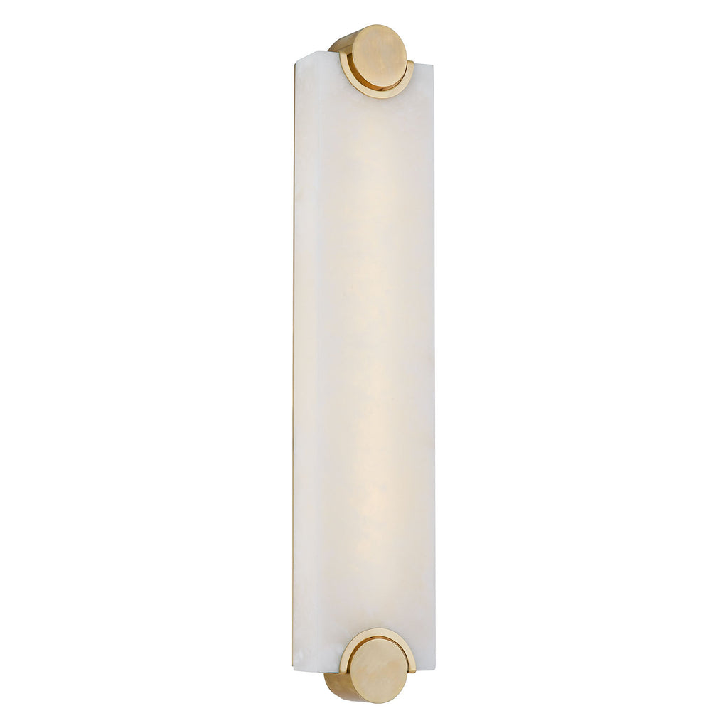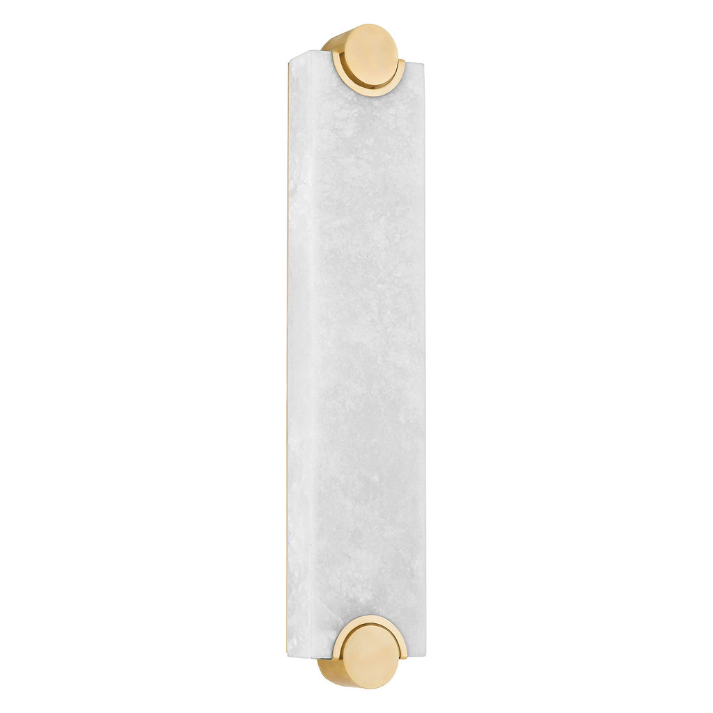 Renowned for built-to-last quality with a timeless feel, Hudson Valley offers a modern lighting collection with elegant touches, recalling vintage inspiration. From dens and dining rooms to bedsides and bathrooms, modern Hudson Valley wall sconces add a pop of light and versatile elegance. A bold, geometric take on a familiar, rectangular sconce silhouette, the modern design of the Hudson Valley Brant wall sconce features oversized Aged Brass circular details on either end. The alabaster shade gives off a warm, gorgeous glow. This piece has a fresh, bespoke feel that is simple and useable.