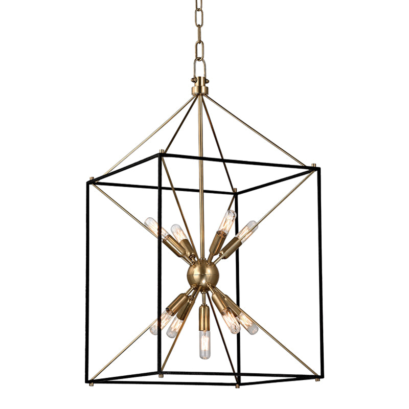 The traditional shape of the lantern, the universal shape of home—Glendale inscribes this icon into the air with a textured black metal cube and four metal rods forming a pyramid. At the center, replacing fires of old, we mount a Sputnik-style light, a starburst of vintage bulbs glinting off the rich tones of the metal ball. Glendale marries warm retro appeal to forward-thinking design.