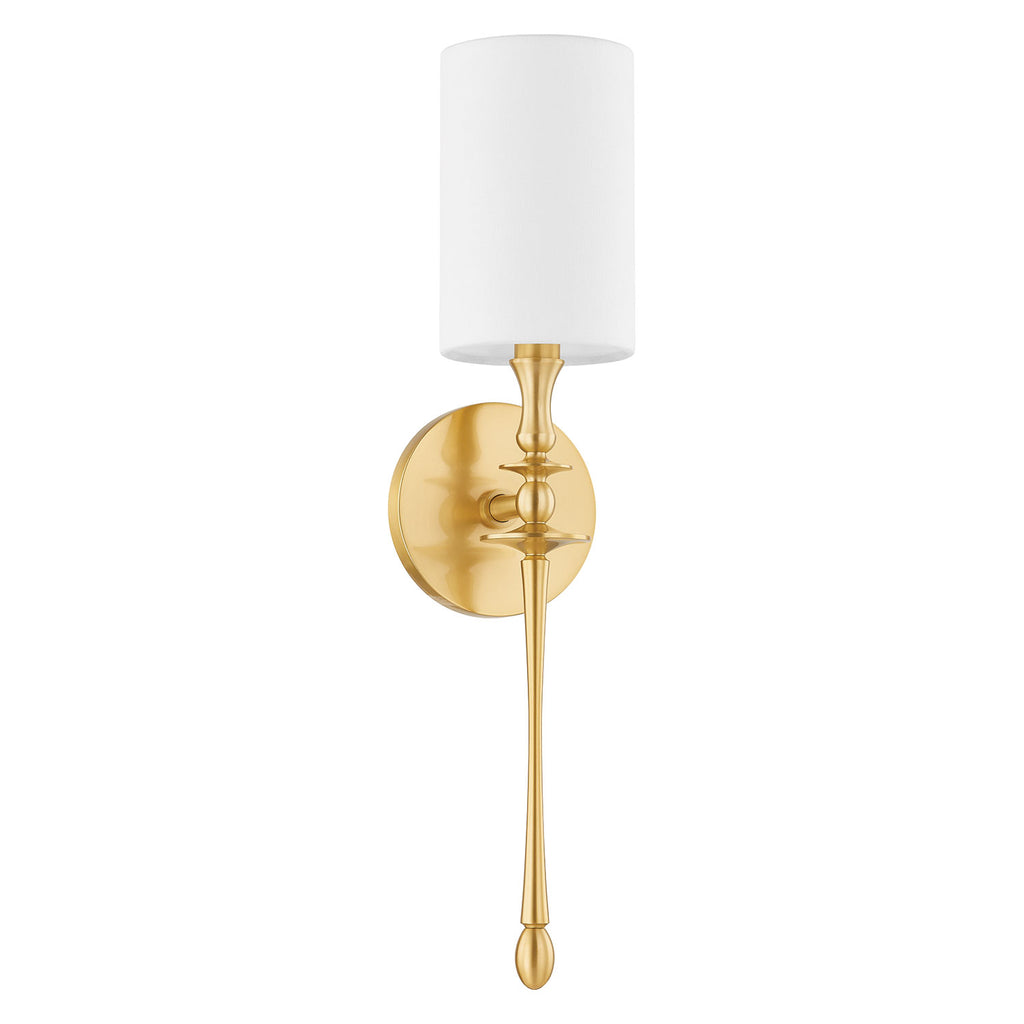 Renowned for built-to-last quality with a timeless feel, Hudson Valley offers a modern lighting collection with elegant touches, recalling vintage inspiration. Steeped in sophistication, Guilford features a long, elegant arm supporting a crisp white linen shade. The decorative, candlestick-like form culminates in a large, slender drum shade. This elegant sconce would look distinguished alongside a fireplace or with multiples down a long hallway. Available in two finishes; Aged Brass and Distressed Bronze.