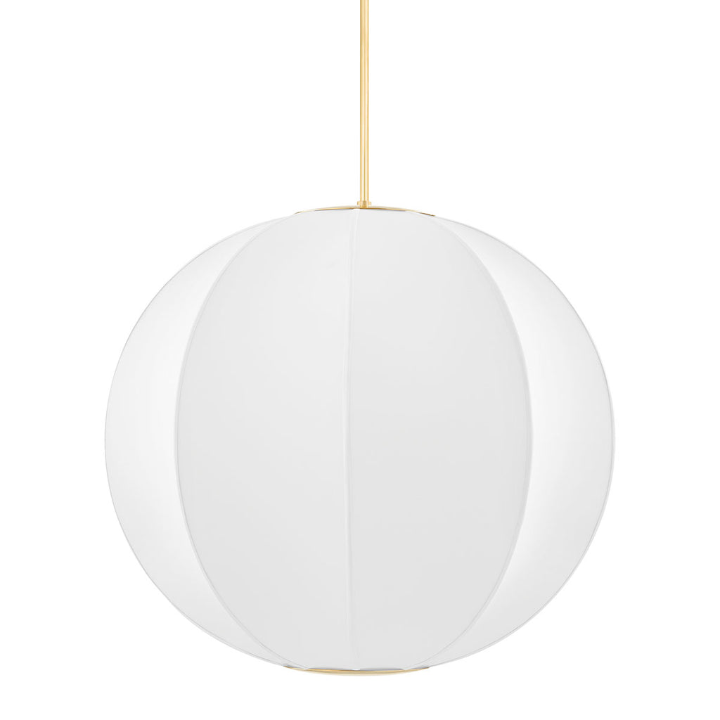 Renowned for built-to-last quality with a timeless feel, Hudson Valley offers a modern lighting collection with elegant touches, recalling vintage inspiration. Shed a little light on your space with modern pendants by Hudson Valley Lighting, which suspend from the ceiling of your dining room or kitchen island, functioning as both practical and elegant.Shed a little light on your space with modern pendants by Hudson Valley Lighting, which suspend from the ceiling of your dining room or kitchen island, functioning as both practical and elegant. As the name suggests, Jupiter is large in scale and draws the eye upward. An aged brass metal frame is wrapped in white stretch fabric creating a dramatic effect even unlit. When lit, light fills the pendant with a gorgeous glow that bounces off the ringed canopy above. Available in two impressive pendant sizes.