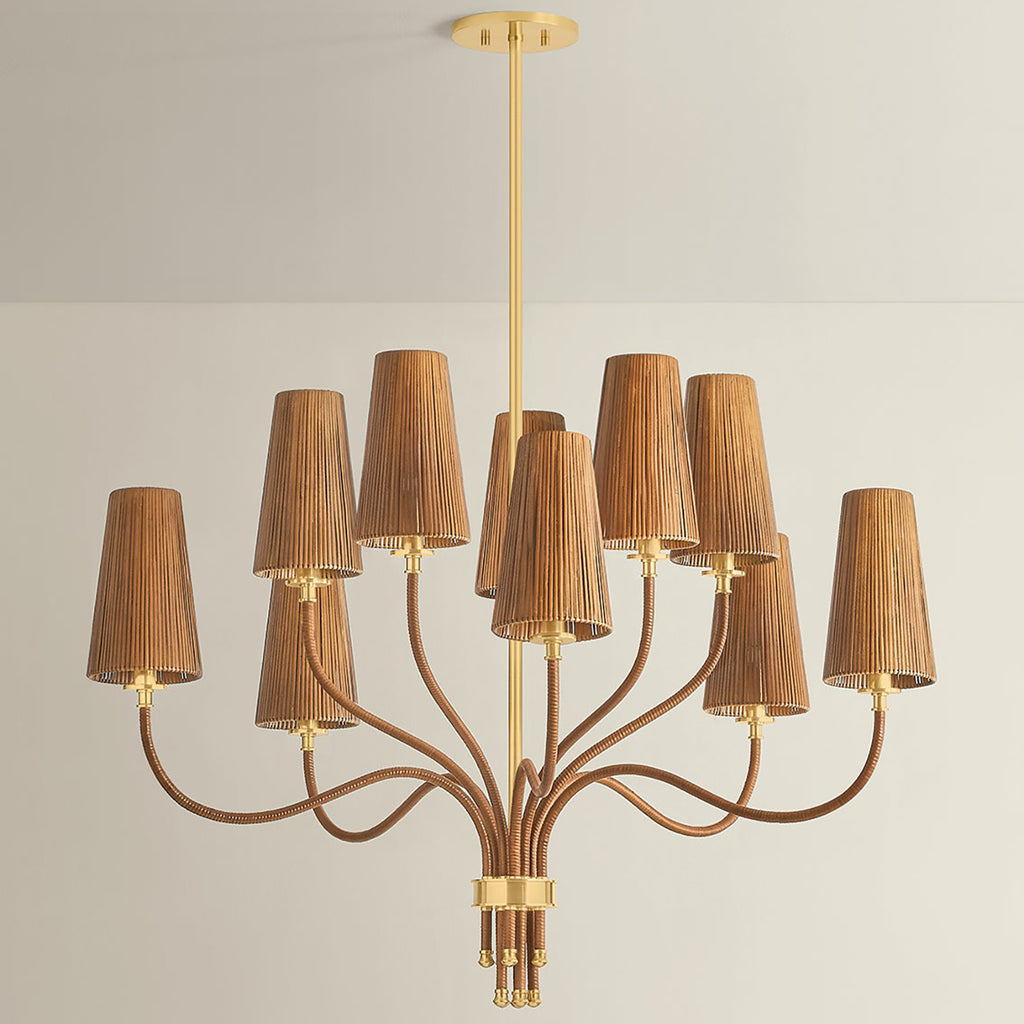 Paying homage to the sinuous creations of Finnish designer Paavo Tynell, the Hudson Valley Lighting Atwood family uses natural materials to form striking branch-like silhouettes. Elongated arms and tapered shades are wrapped in rattan skin, creating an earthy, global statement. The metal rod, bobèches, and cuffs are finished in Aged Brass, lending a luxurious feel. Available as a 1-light sconce, 6-light chandelier, and 10-light chandelier, these pieces are designed to be layered throughout the home.