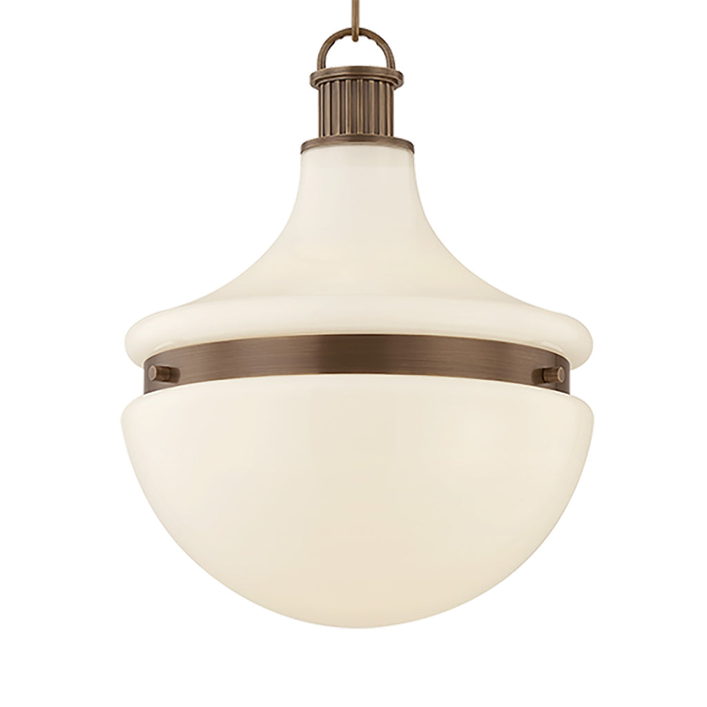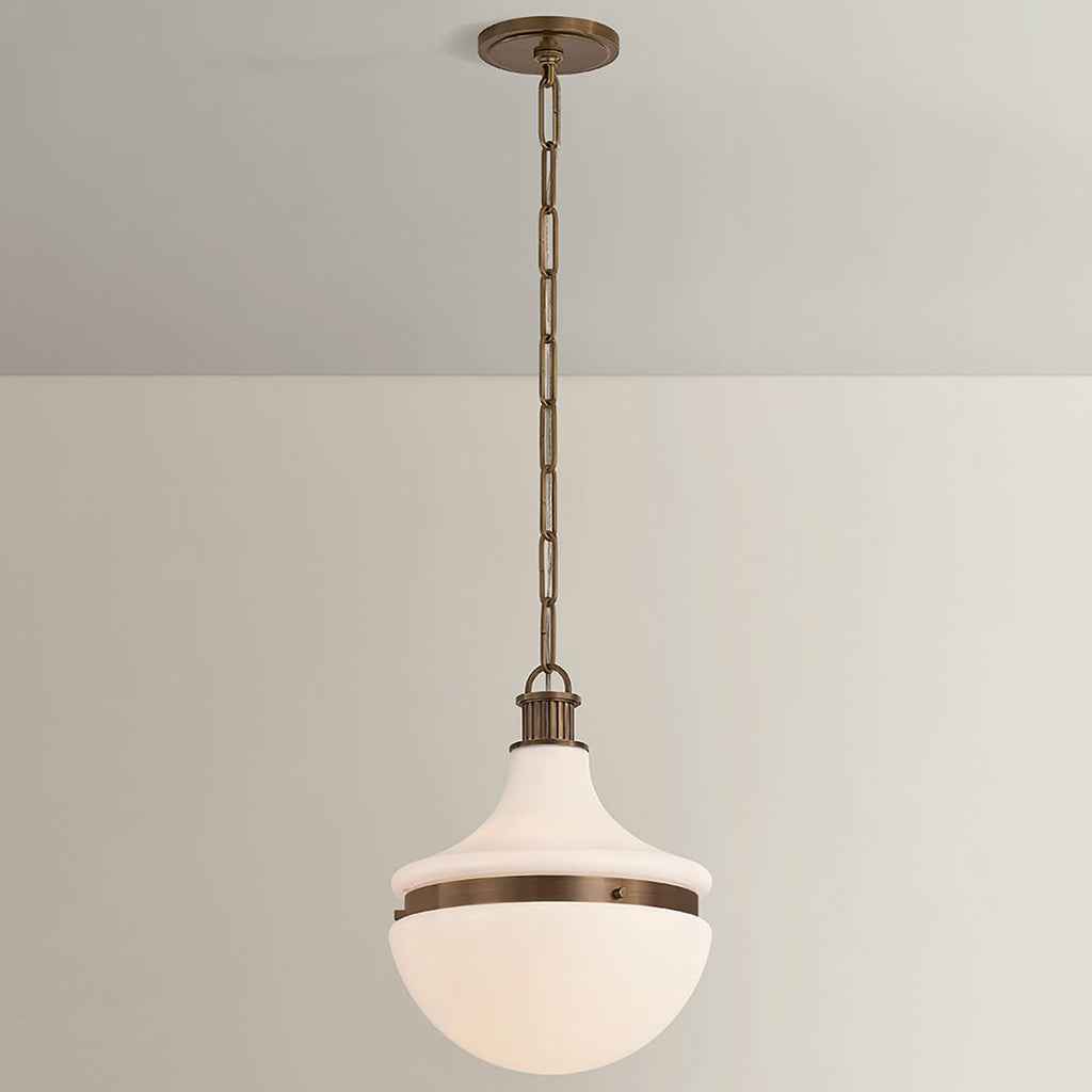 The Hudson Valley Lighting Barryville pendant filters historical design inspiration through a contemporary lens. Paying homage to the work of Peter Behrens, it features an antique silhouette reimagined for today. The Heritage Bronze metalwork pairs beautifully with the shiny opal glass shade. Details like the architectural fluted socket cups, decorative top loop, and uniform chain root Barryville in this century. Comes as one light available in two sizes.
