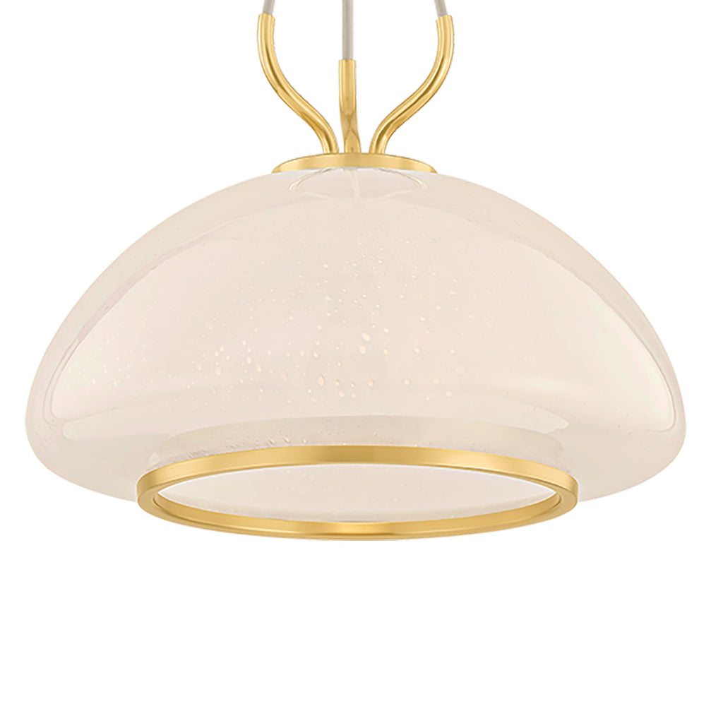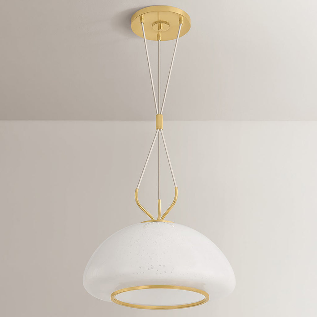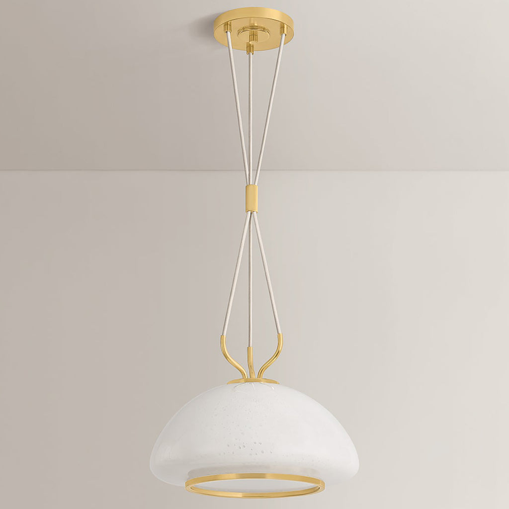 The Hudson Valley Lighting Baudette pendant will be your new favorite. The perfect mix of craftsmanship and customization, it features a large cloud seedy glass shade that is suspended from three beige braided fabric cords. A movable metal ornament allows you to adjust the gathering point to suit your space, from a kitchen island to a breakfast. Baudette is available in two sizes and trimmed with Aged Brass.