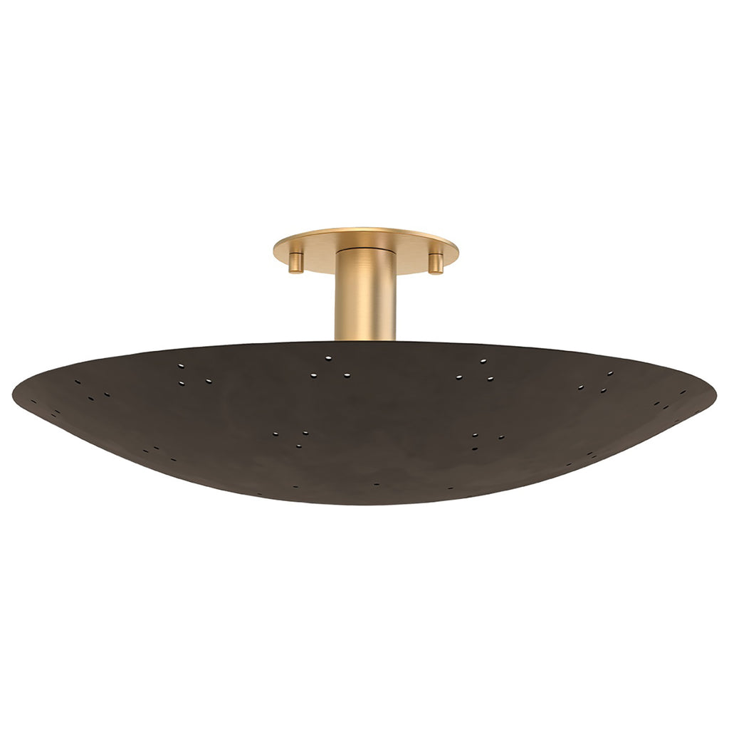 The streamlined, disc-shaped form of Hudson Valley Lighting Bern gives this flush mount a distinctly futuristic feel. The shade’s minimalist design is enhanced by perforated details that draw the eye. As light filters through the perforations, it creates a starry effect that is particularly striking against the deep finishes. Available in two sizes with a Vintage Brass finish or a Vintage Brass and Bronze combination.