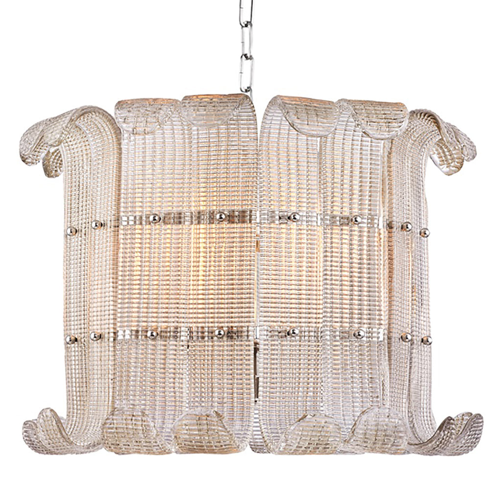 Glass is hand-poured into molds, then bent to form the distinctive panels that are the first thing you notice when you look at Hudson Valley Lighting Brasher. The texture of these panels refracts the light coming through, while the glass itself is infused with a soft champagne hue. The metal work is aesthetically pleasing in its own right, seen from underneath, glimpsed obscurely through the diffusers, and accentuated with spherical attaching pins.