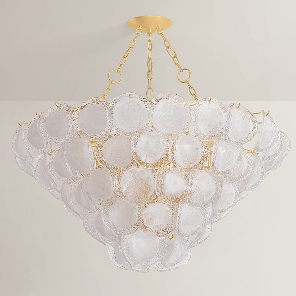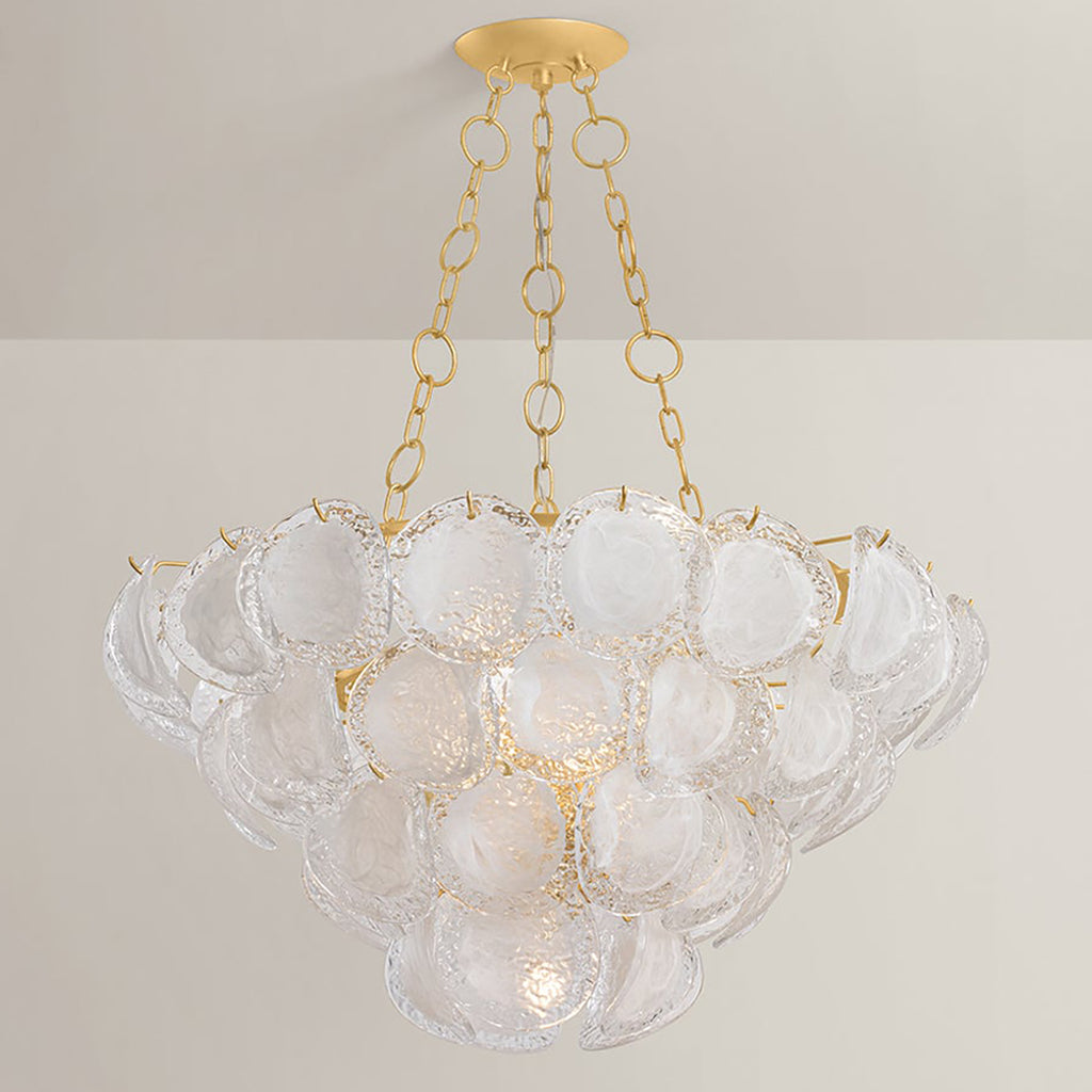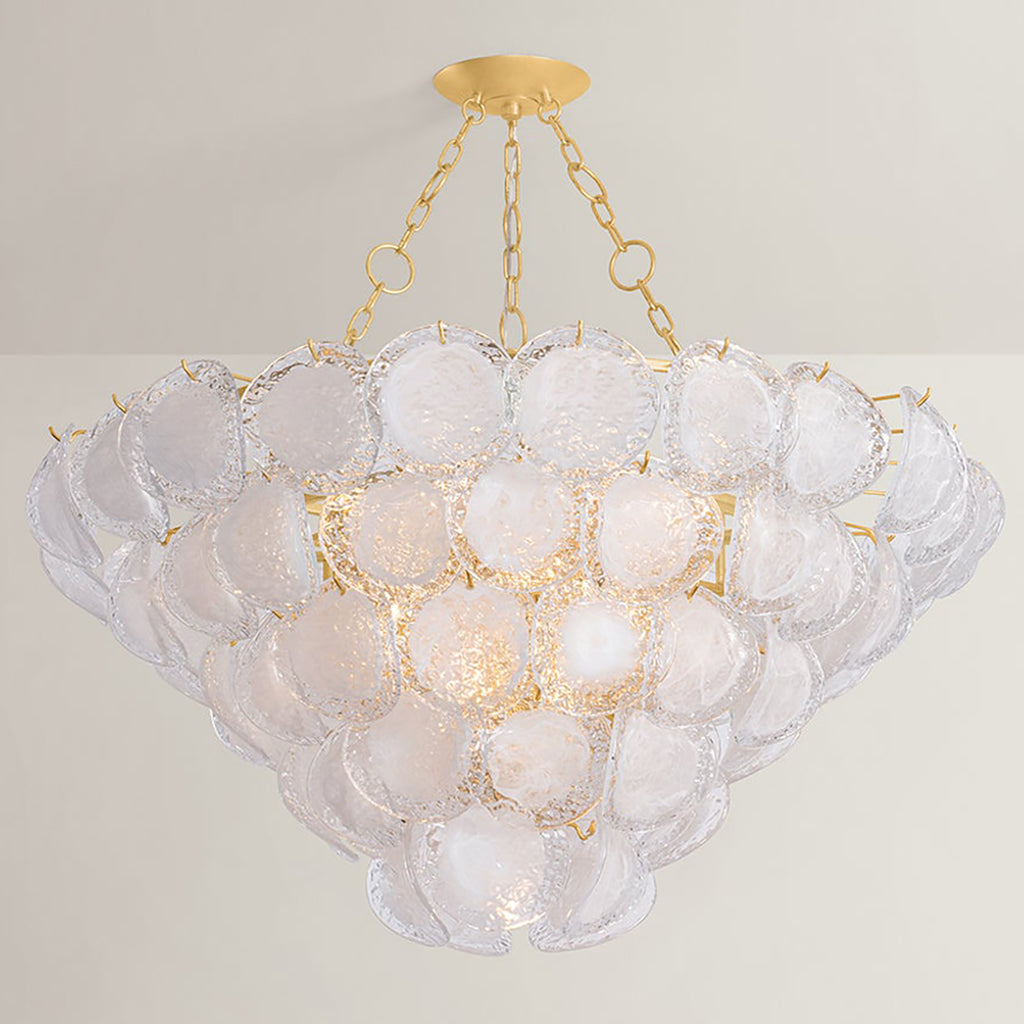 A celebration of maximalism, Hudson Valley Lighting Cedar Hill is a whimsical tiered showpiece composed of painterly glass panels. Each suspended panel of Blonchino piastre glass curls slightly outwards, adding volume to the composition. Viewed from the side, Cedar Hill recalls a cluster of grapes on the vine; from below, it blooms like a rose. This lustrous fixture is available with 5, 9, or 17 lights with a Vintage Gold Leaf finish.
