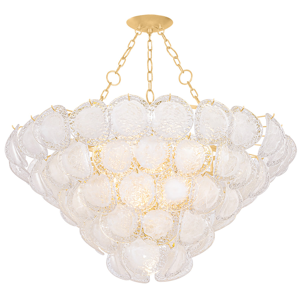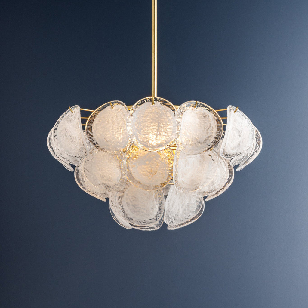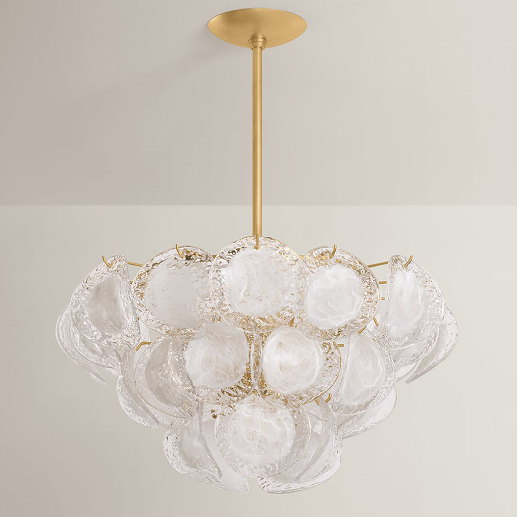 A celebration of maximalism, Hudson Valley Lighting Cedar Hill is a whimsical tiered showpiece composed of painterly glass panels. Each suspended panel of Blonchino piastre glass curls slightly outwards, adding volume to the composition. Viewed from the side, Cedar Hill recalls a cluster of grapes on the vine; from below, it blooms like a rose. This lustrous fixture is available with 5, 9, or 17 lights with a Vintage Gold Leaf finish.