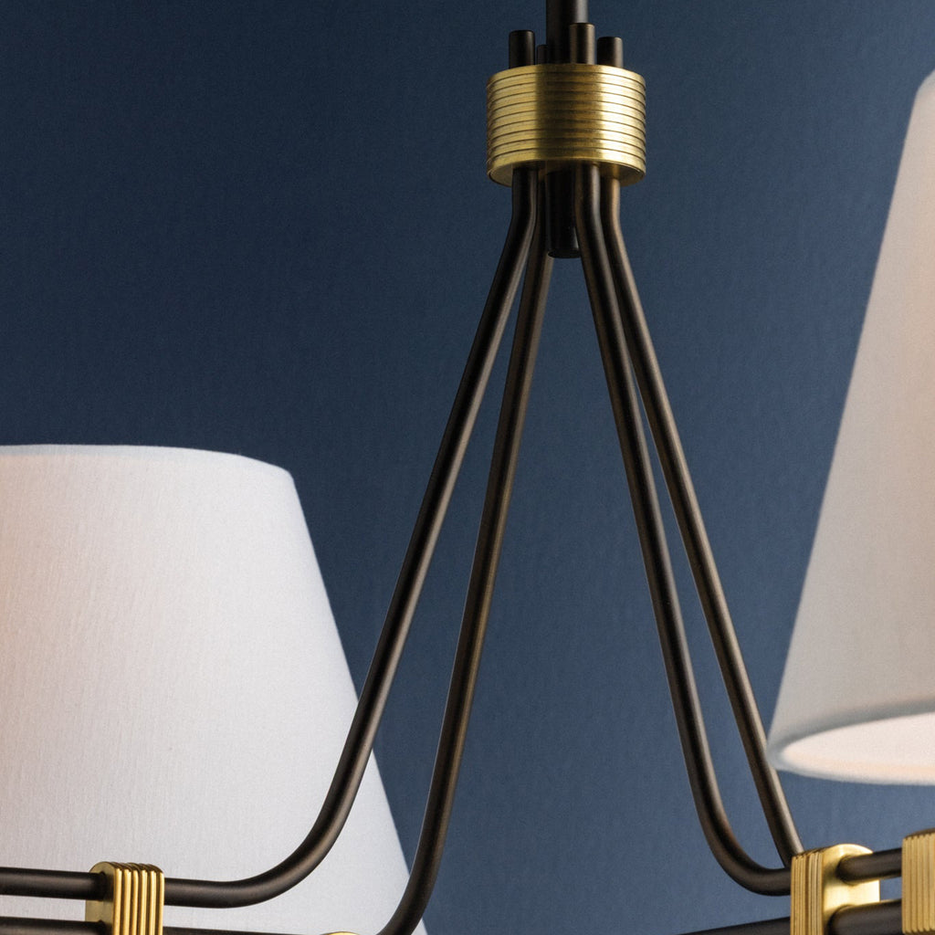 Inspired by modern mechanics, the Hudson Valley Lighting Crown Heights family features exposed connection points with eye-catching mixed metal finishes. The slender metal frame is finished in Dark Bronze with lighter Aged Brass racetrack accents that speak to the design’s industrial signature. Crown Heights is available as a wall sconce, a 2-light island pendant, and a 4-light chandelier.