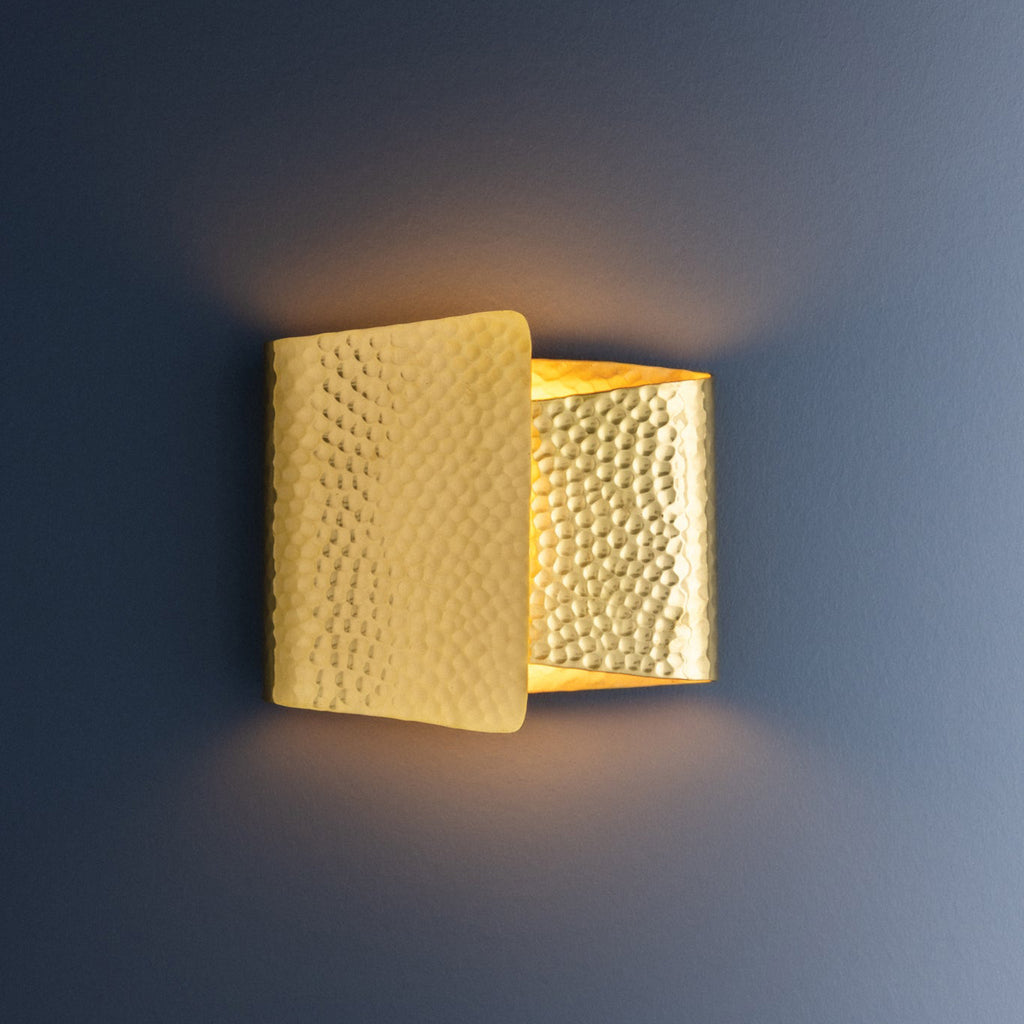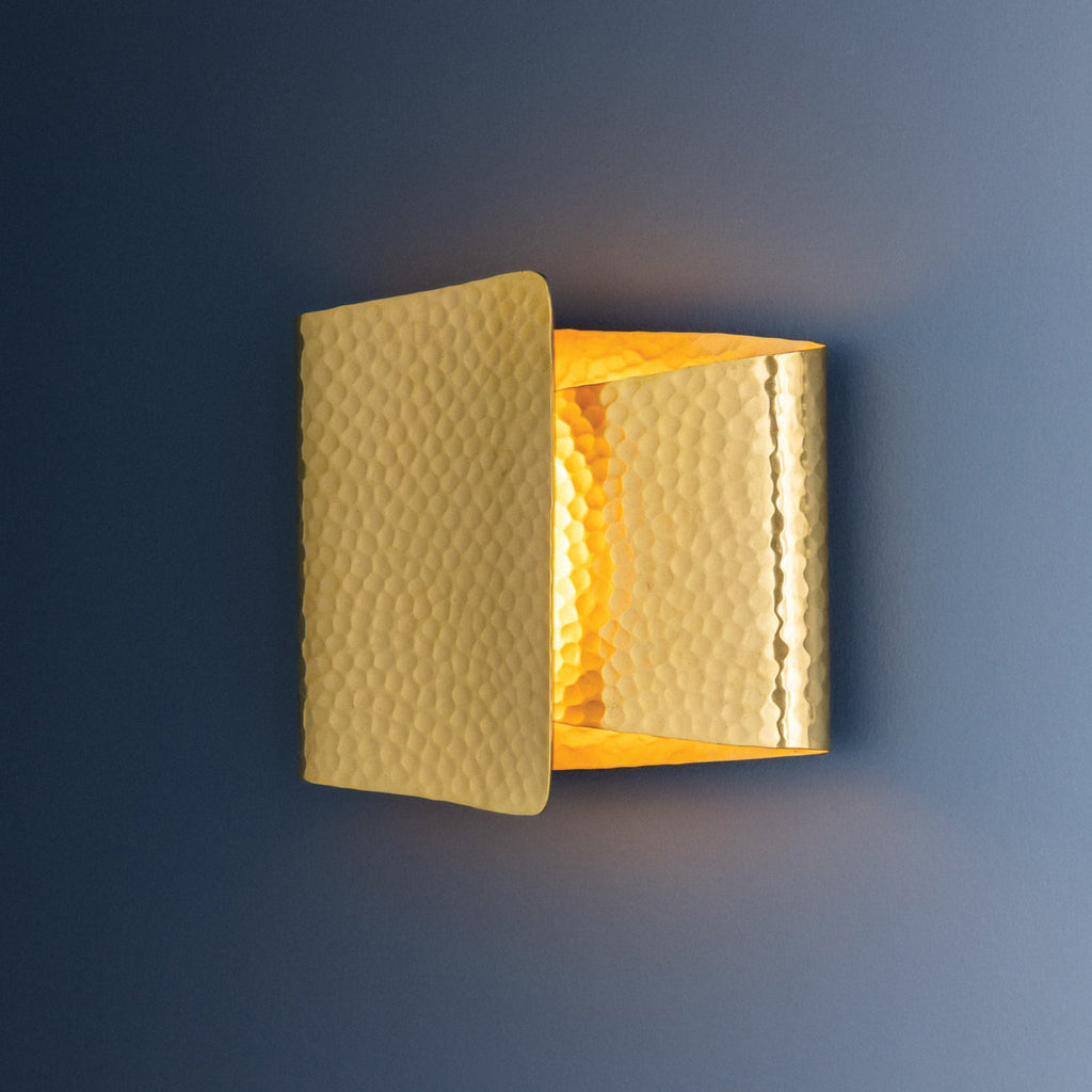 The poetic Hudson Valley Lighting Dunnsville sconce is made from a single piece of hammered metal that curls inward to shade an LED light source. Gestural and rhythmic, this layered silhouette directs ambient light out of multiple sides. Finished in Aged Brass, Dunnsville makes a high-design statement on the wall.