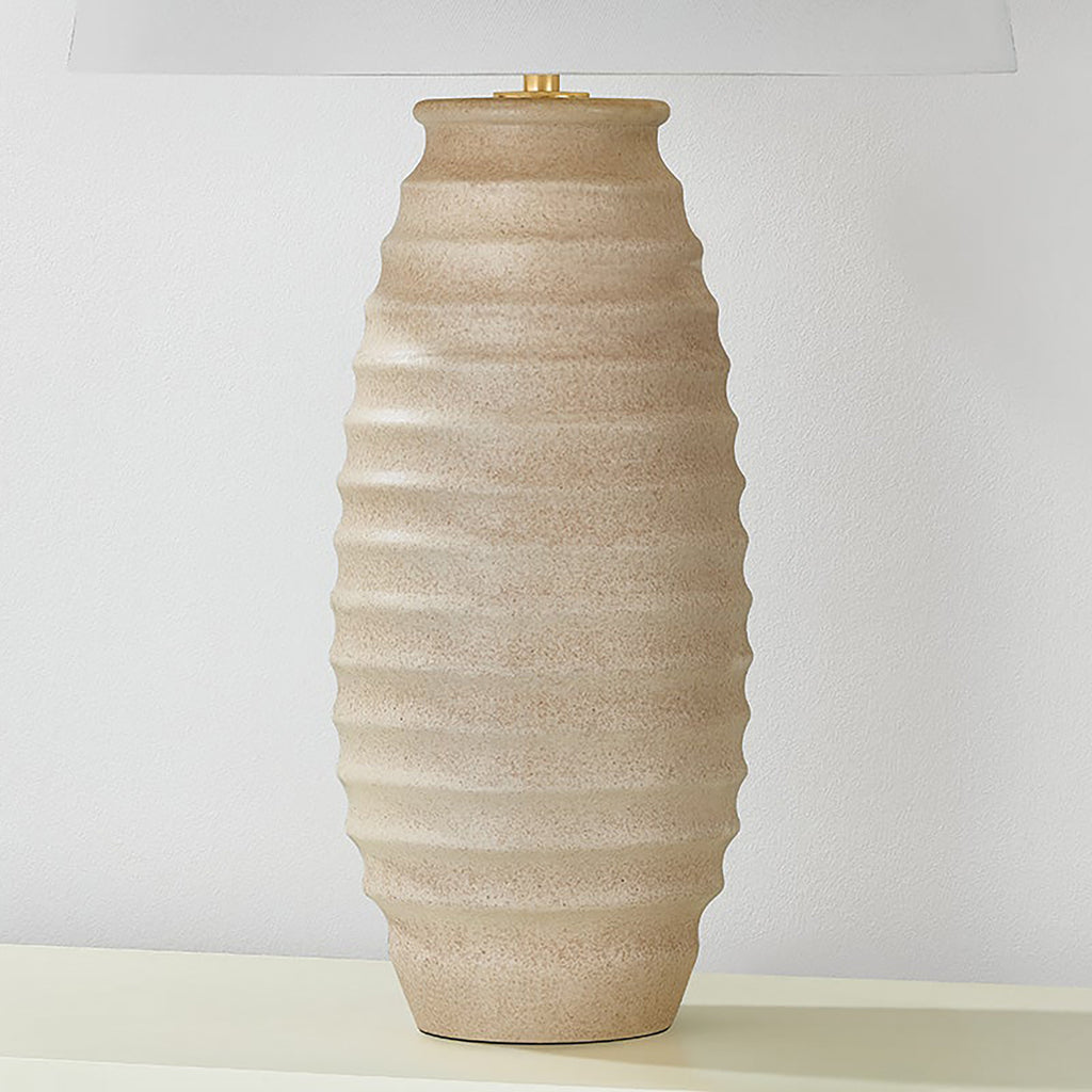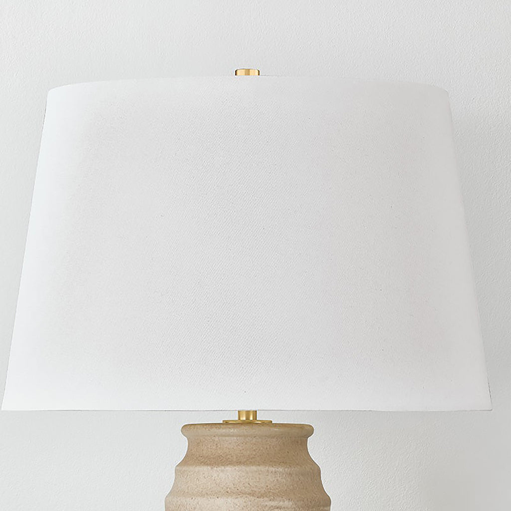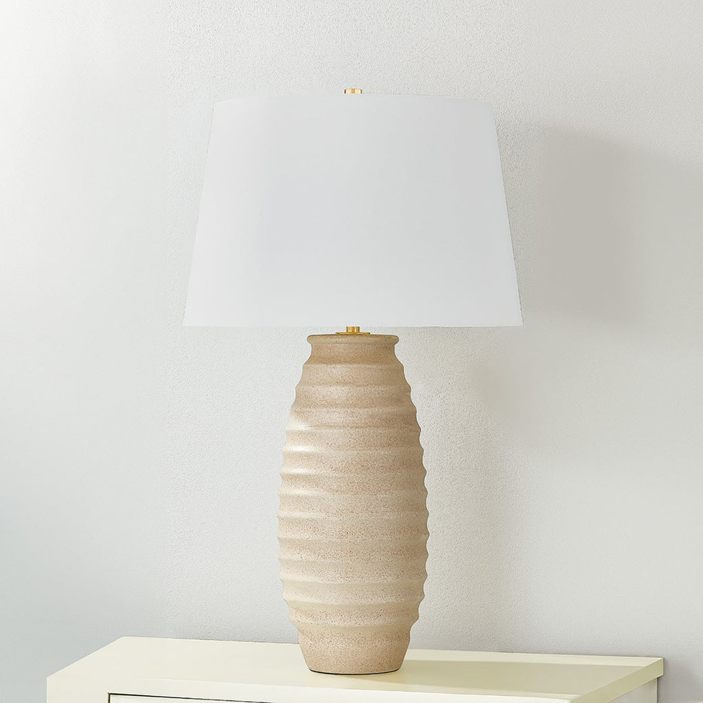 Bringing a fresh-from-the-studio feel to modern interiors, this evocative table lamp features a ceramic base with deep, organic grooves. Reminiscent of terracotta, the sculpted base is a testament to the skillful artisanship behind the piece. A large white linen drum shade provides a tailored counterpoint to the soft form, while Aged Brass hardware finishes Hudson Valley Lighting Haddam on a bright note.