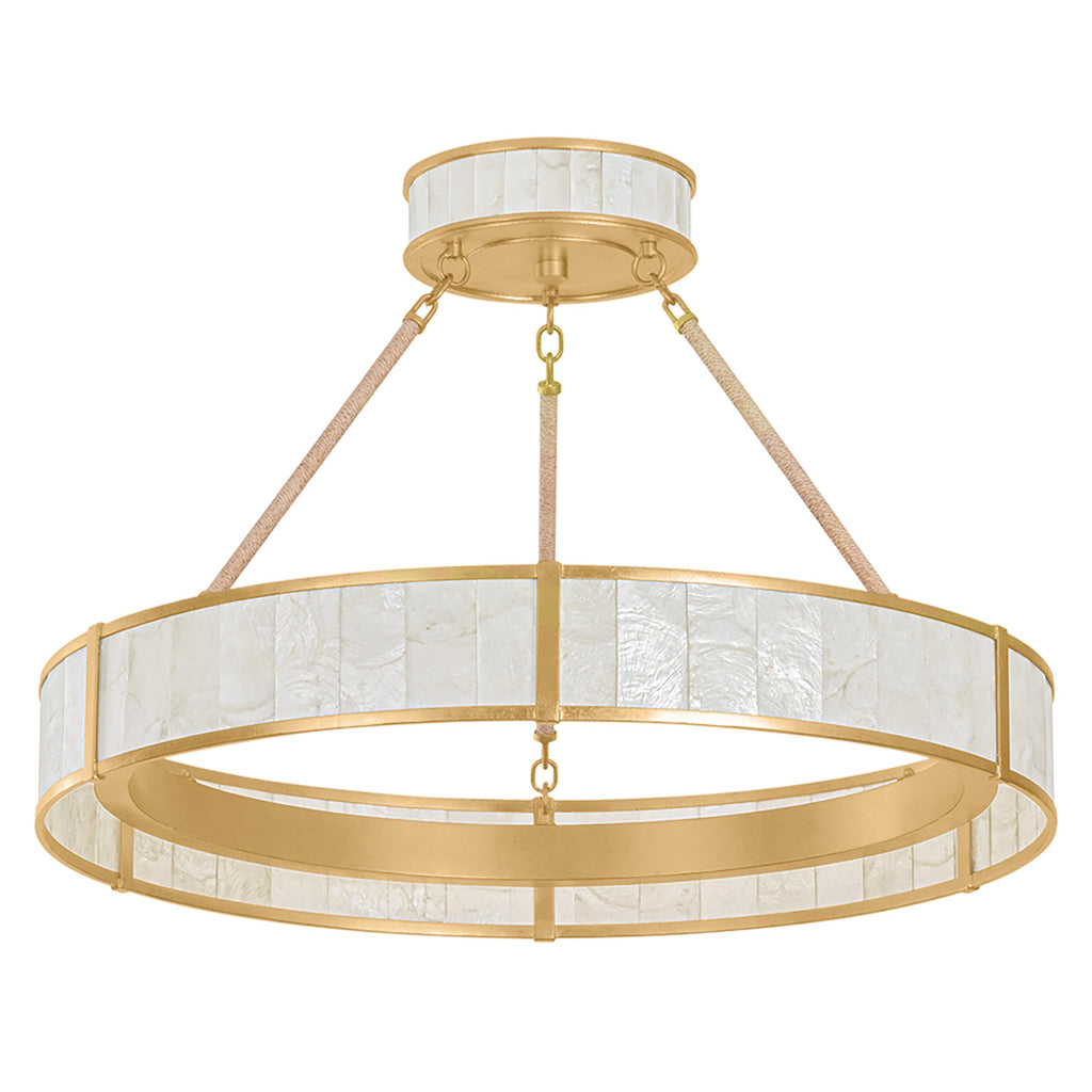 The ethereal Hudson Valley Lighting Halcott ring chandelier is constructed of luminous capiz panels that recall the iridescence of mother-of-pearl. As the Vintage Gold Leaf frame brings out the natural glow, the abaca rope-wrapped suspension contributes to the coastal beauty of this fixture. Available in two sizes, Halcott makes for a gleaming one-of-a-kind focal point.