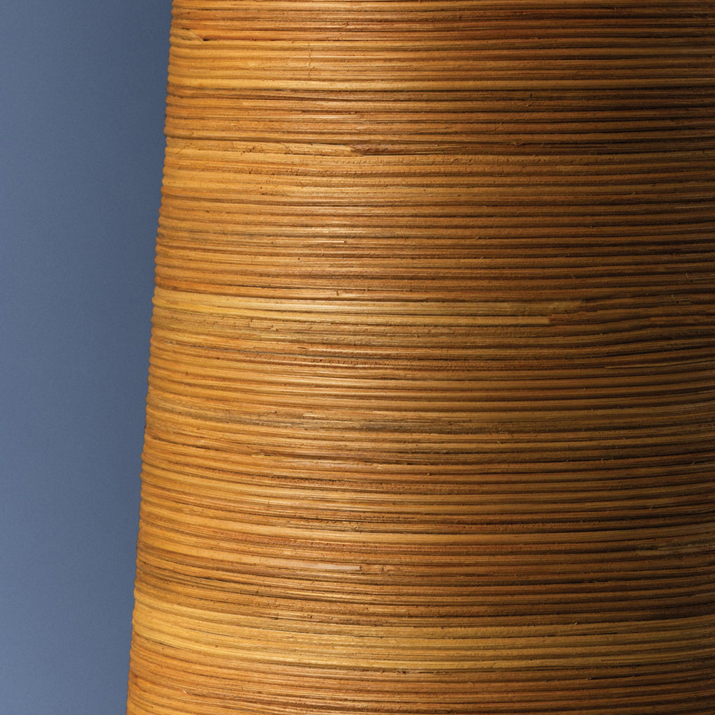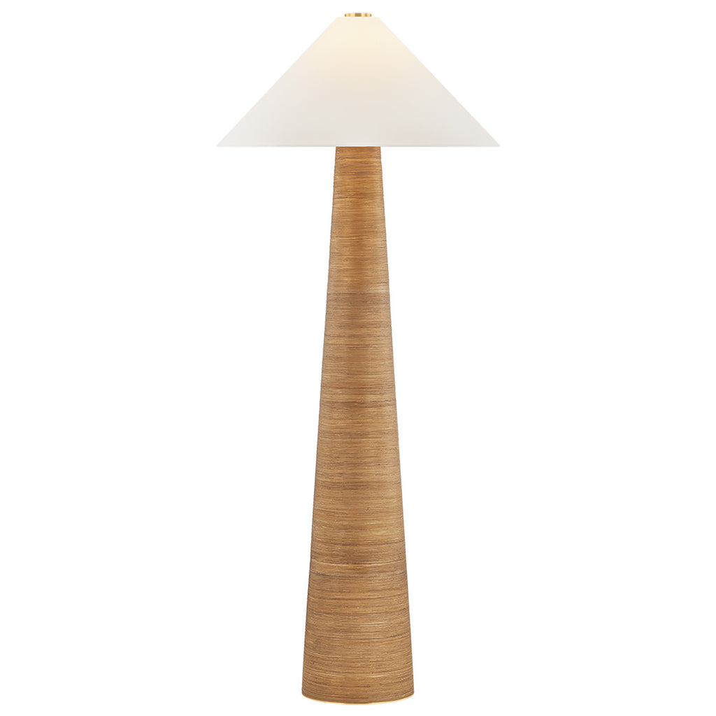 Modern tapered silhouettes are wrapped in the natural richness of rattan in the Haviland family. As either a floor or table lamp, the designs call to mind the shape of a palm tree, topped by a crisp white linen shade. An Aged Brass rim contributes a subtle shine at the base of each design-forward light.