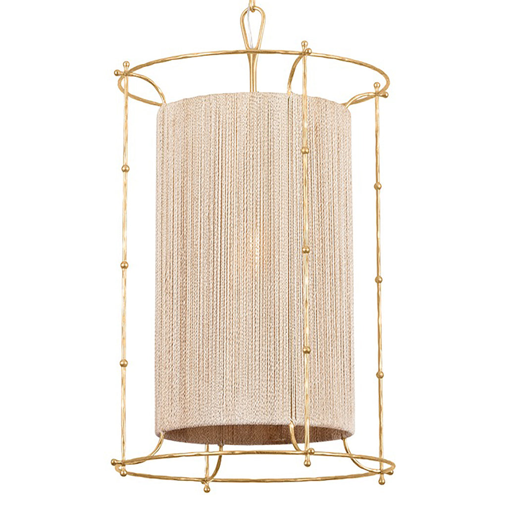 A pendant and lantern fusion, Jones Point makes an earthy first impression with natural materials and fine craftsmanship. Designed to resemble tree branches, a hammered metal cage finished in Vintage Gold Leaf surrounds an inner shade. Woven in a unique criss-cross pattern from bleached abaca, the shade’s linear grain mirrors the pleasing verticality of the frame. Jones Point provides warm illumination as it hovers above dining tables, entryways, and more.