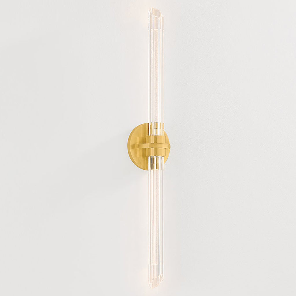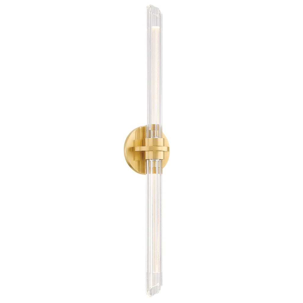 Designed to provide ambient lighting in a bath area, Hudson Valley Lighting Knighton features a slender glass rod design with integrated LED. The faceted, clear extruded glass creates a layered effect, adding texture while creating a soft diffusion of light. The minimal Aged Brass metalwork is positioned both inside and outside the glass, heightening the dimensionality of this upscale sconce.