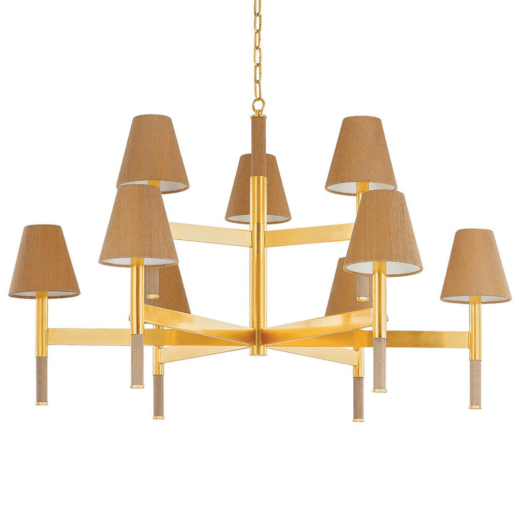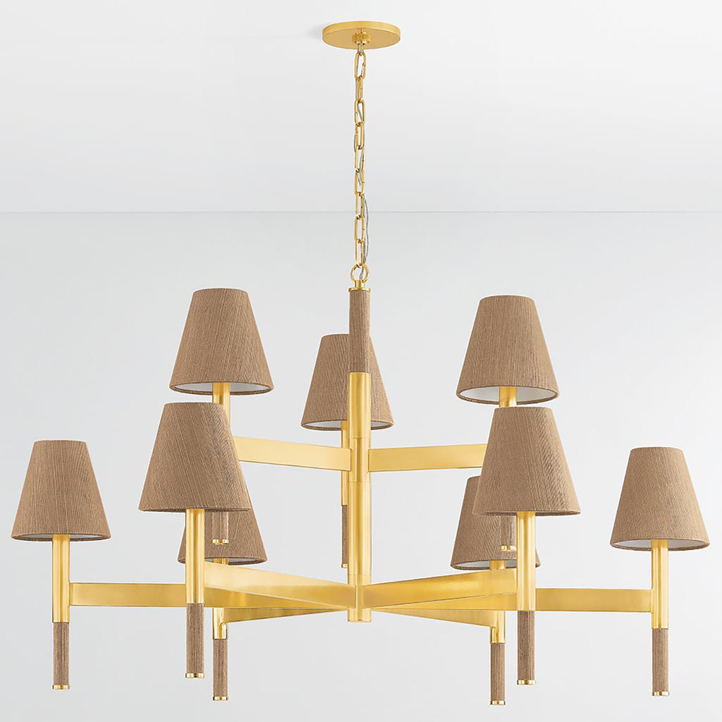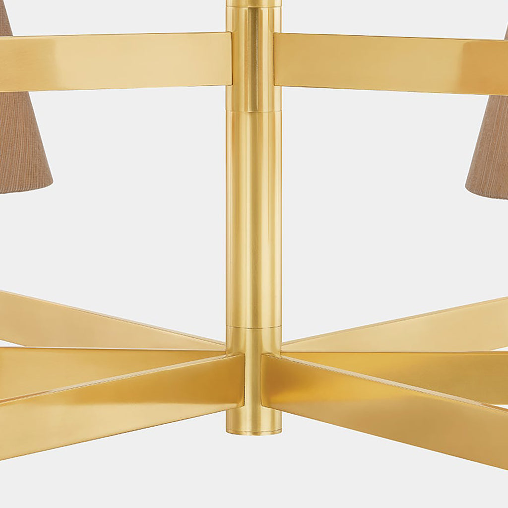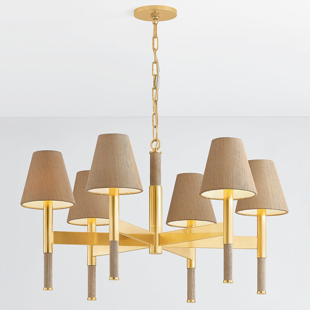 Wrapped, woven, and precision-fitted elements elevate the traditional silhouette of Hudson Valley Lighting Lindenwood. Creating an exciting conversation between natural and manmade elements, the Aged Brass metalwork supports grasscloth-covered stems and shades. Available as a 1-light sconce and a 6 and 9-light chandelier, Lindenwood fixtures layer well together in a contemporary space.