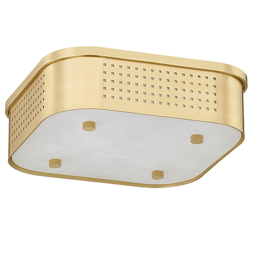Bringing two striking materials together, Hudson Valley Lighting Madison Square features a thick panel of alabaster recessed into a sleek metal shade. Perforations in the shade add a graphic edge to this flush mount while facilitating side illumination. When the LED is illuminated, the milky alabaster comes alive with a warm, welcoming glow. Choose between two distinctive finish options: Aged Brass for a timeless elegance or Distressed Bronze for a more industrial feel.