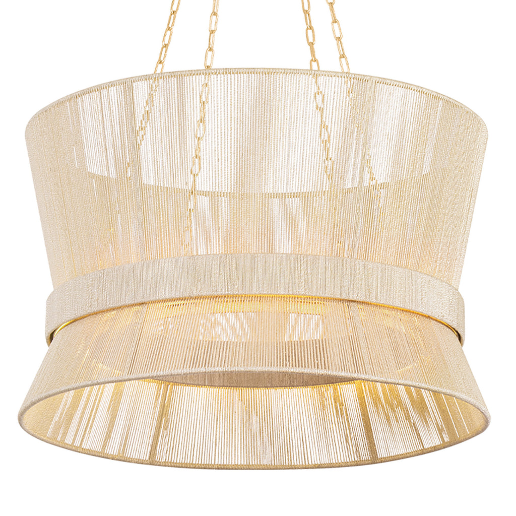Channeling traditional basketry, the shade of the Ocean Hill pendant is handwoven from fine abaca. A belt of matching string wraps around the center, accentuating the hourglass shape of the fixture. LED light filters through the dense weave to create an inviting glow. Suspended by four chains finished in Vintage Gold Leaf, Ocean Hill is the perfect reminder of how exciting modern craftsmanship can be.