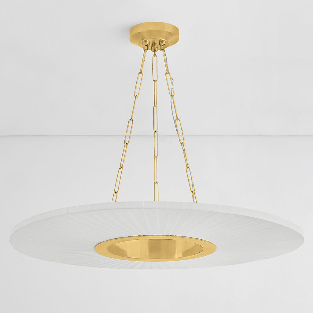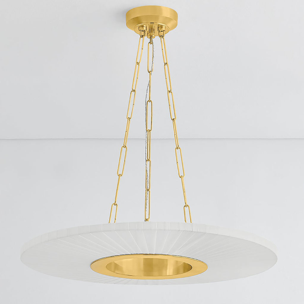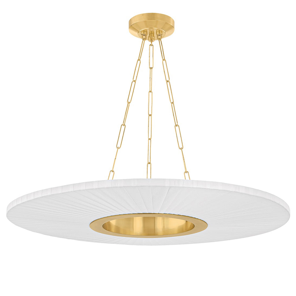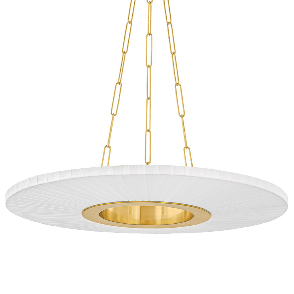 Blending the modern with the traditional, Hudson Valley Lighting Prattsburgh features a classic shape, unique wrapping technique, and a jewelry-like chain. Open at the center, the disc-shaped shade is wrapped in faux silk, creating a textural pattern that calls to mind a pleated lampshade. Illuminated by an internal LED, this distinctive chandelier emits a glowing halo of light. The Aged Brass finish on the frame gives Prattsburgh a subtly antique feel.