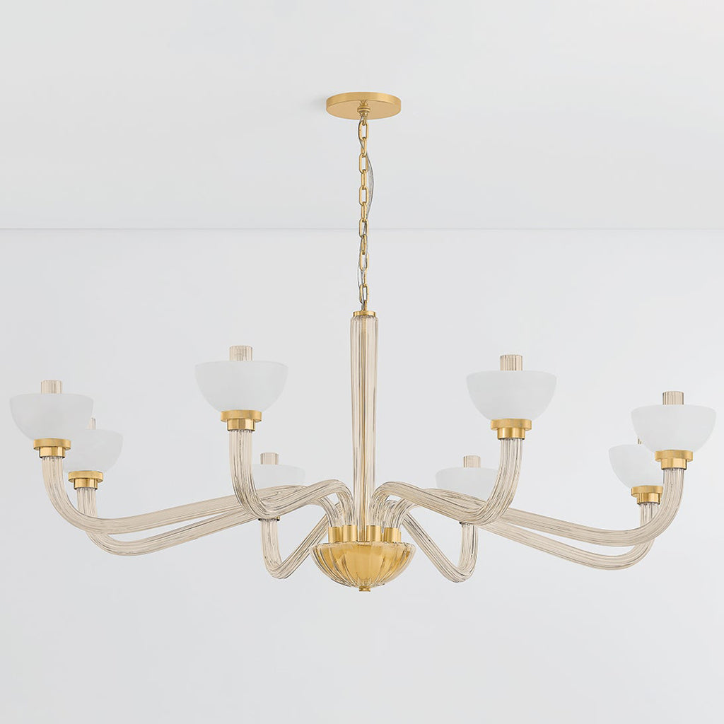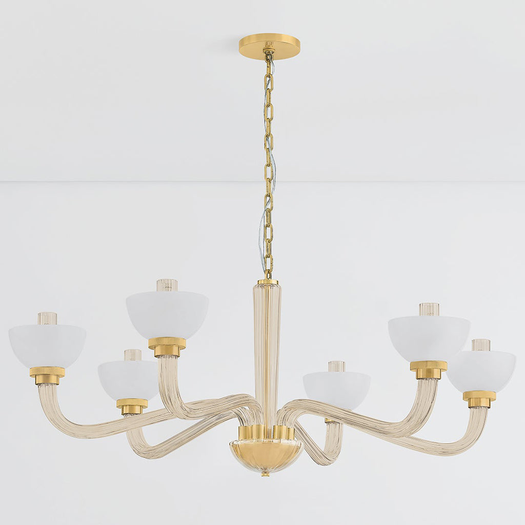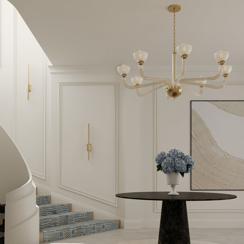 Vintage-inspired shaping, layered glass, and sophisticated finishes elevate the surprising silhouettes of the St. Lawrence family. Offering contemporary interpretations of classic motifs, the fluted champagne glass branches extend into upturned bowl-shaped opal seedy glass shades. Sleek Aged Brass metalwork complements the retro forms. St. Lawrence is available as a 1-light sconce or 6 or 8-light chandelier.