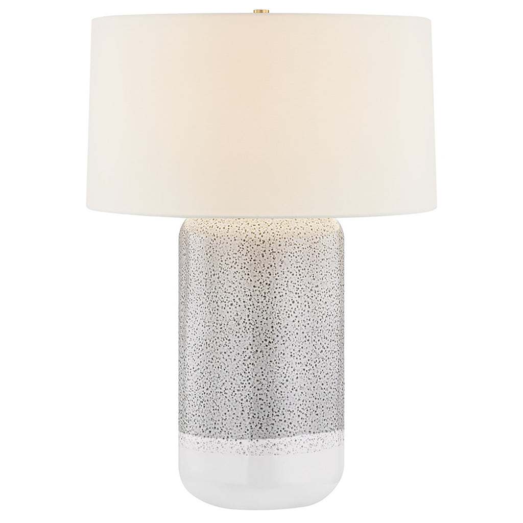 The pleasing, graphic shape of the Hudson Valley Lighting Washingtonville table lamp is paired with a highly artisanal, textural ceramic finish. Its smooth, pill-shaped base features a Blue Shore glaze with a subtle, speckled texture. The softly curving base is paired with an oversized white linen drum shade, creating an organic look for contemporary interiors.