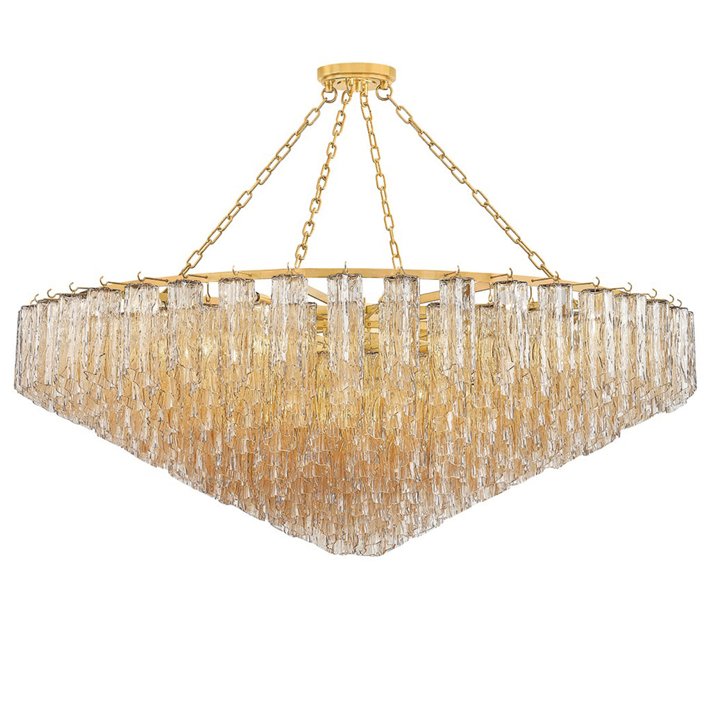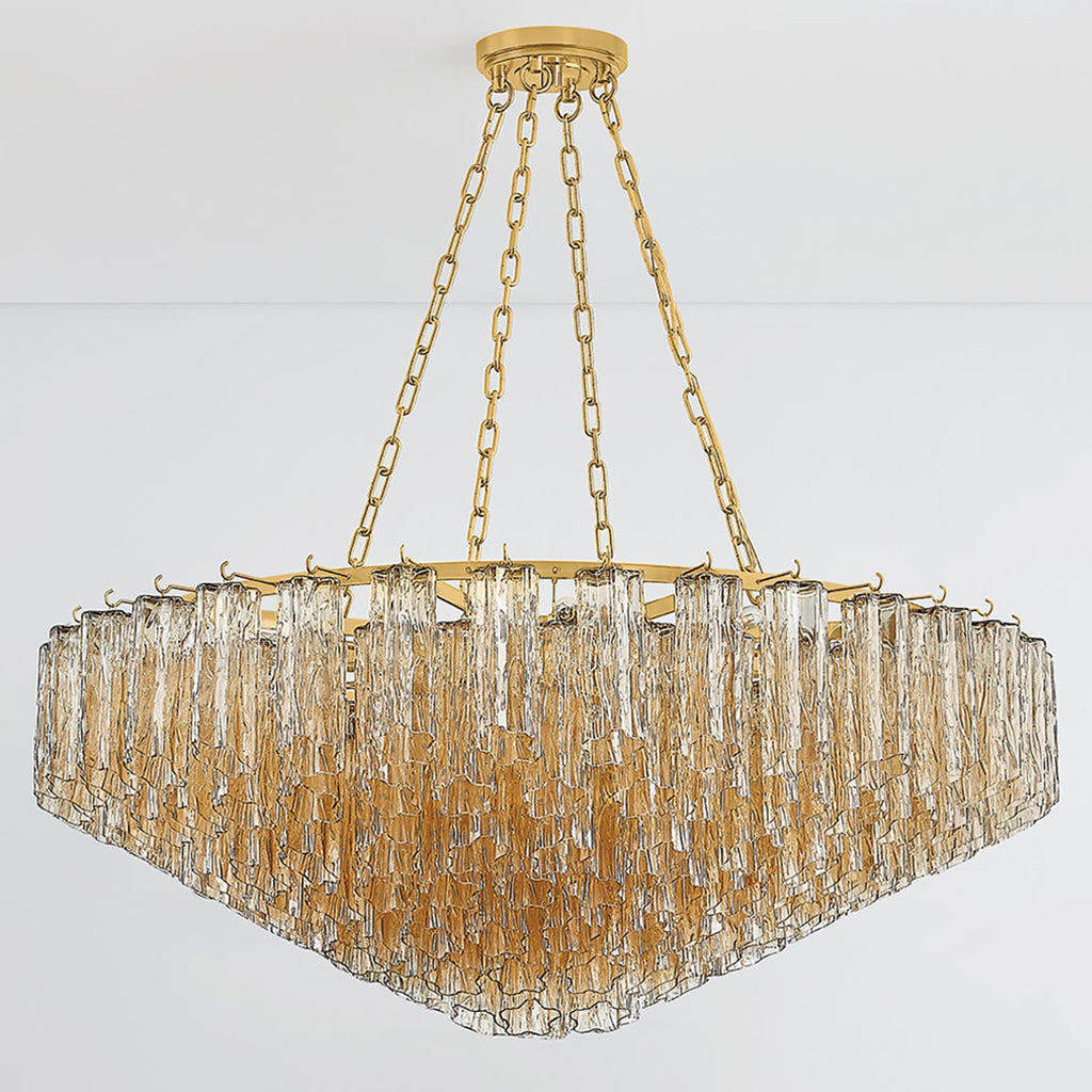 The incredible quantity of layers, lights, and complex glass shapes make Watertown a dramatic showstopper. Inspired by Art Deco aesthetics, this maximalist chandelier features organically shaped Tronchi glass shades with textured cuts. The shades are arranged to form a descending point at the center, reminiscent of water droplets. Watertown is available with 9, 21, or 45 lights.