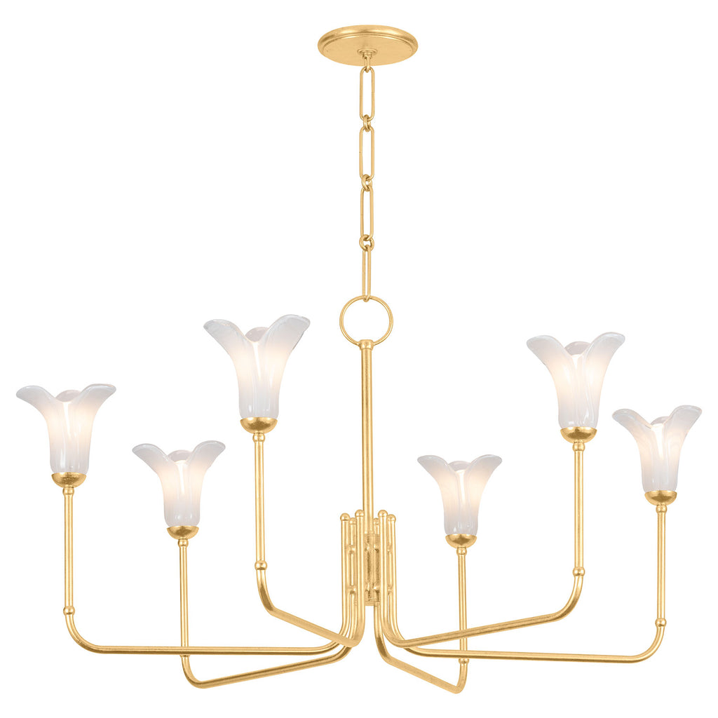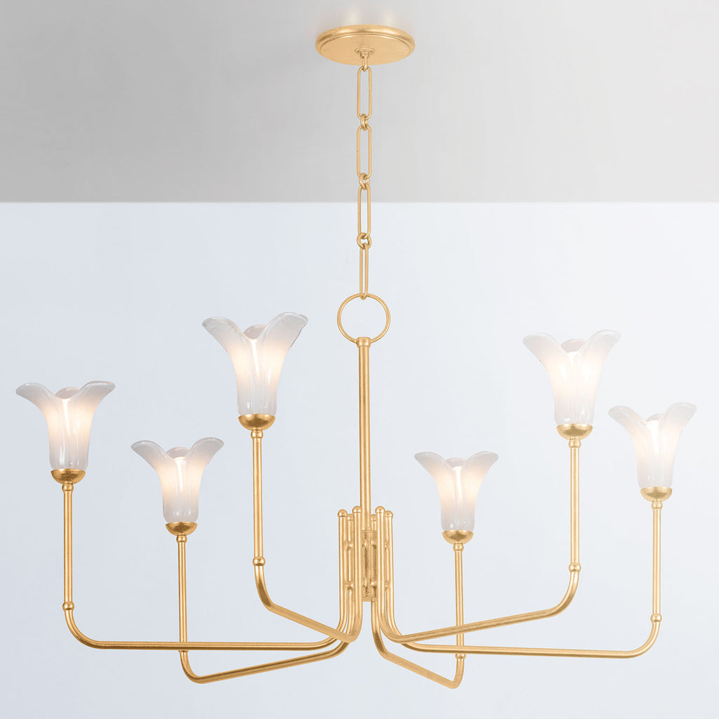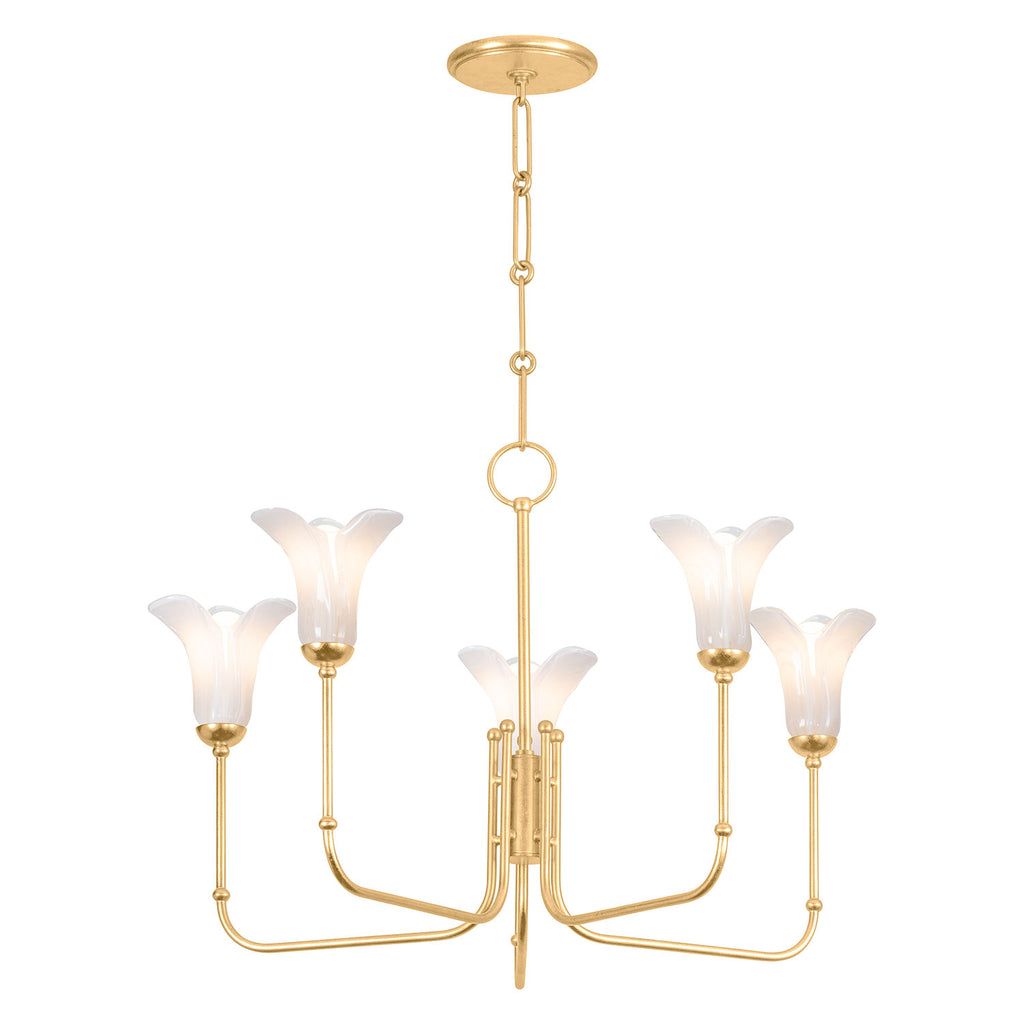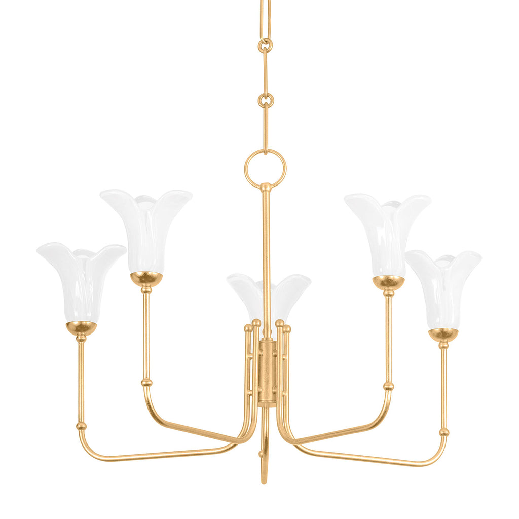 Renowned for built-to-last quality with a timeless feel, Hudson Valley offers a modern lighting collection with elegant touches, recalling vintage inspiration. In tribute to the beauty of nature, white Bianca glass shades resembling flowers bloom upwards, supported by slender Vintage Gold Leaf arms. With an opaque quality, the shades soften the bulbs within, creating a gentle diffusion of light. Like fine jewelry, delicately inlaid gold beads embellish the arms of this fixture, further enhancing the romantic quality. Rooted in Art Deco design, Montclair is available as a wall sconce or chandelier in two sizes.