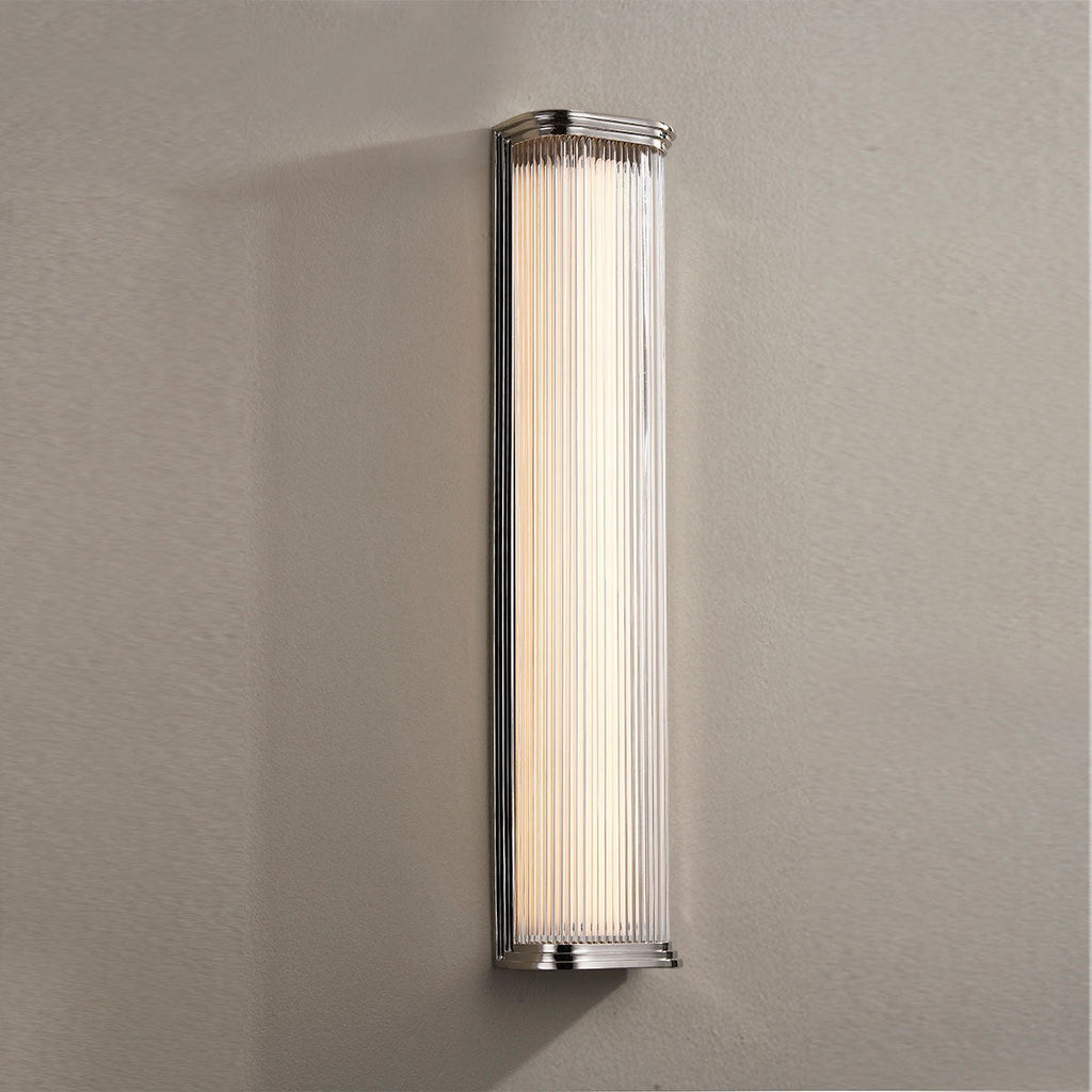 Renowned for built-to-last quality with a timeless feel, Hudson Valley offers a modern lighting collection with elegant touches, recalling vintage inspiration. The Hudson Valley Newburgh wall sconce gives new life to the classic glass rod sconce. A soft rectangular metal frame with stepped detailing holds clear glass rods that make up the shade of this art deco-influenced design. Available in two sizes and two finishes, Newburgh would work wonderfully in a bath or home theater setting.