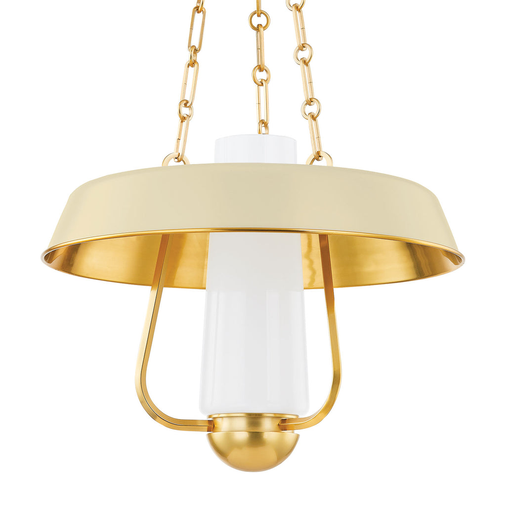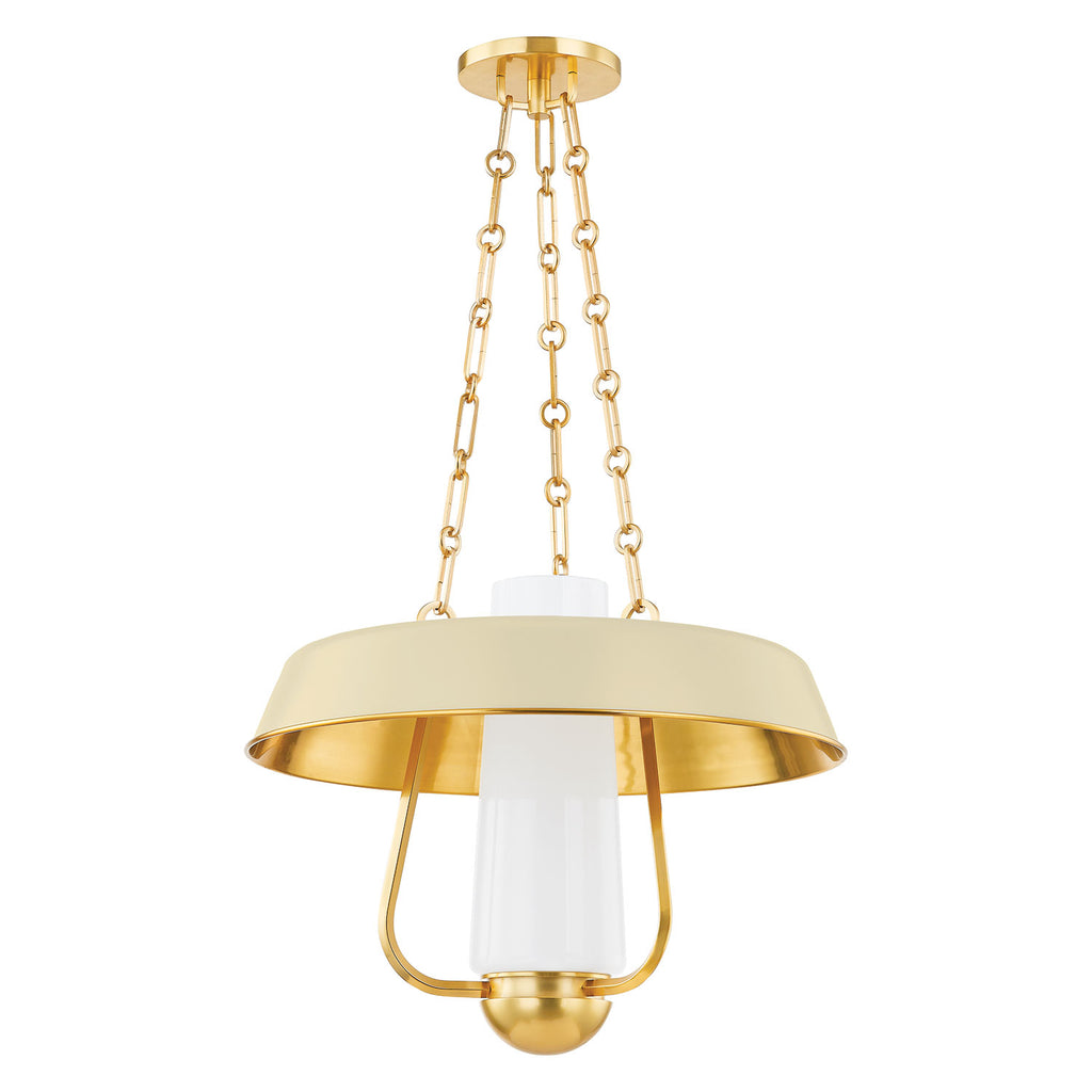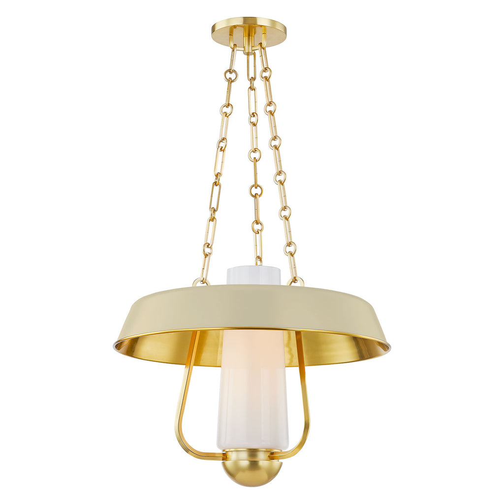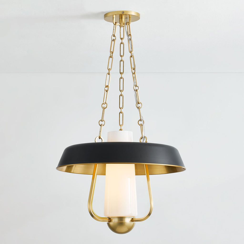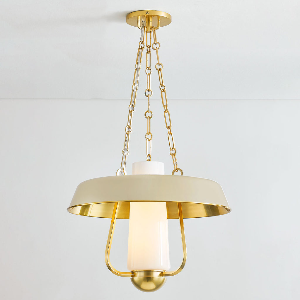 Renowned for built-to-last quality with a timeless feel, Hudson Valley offers a modern lighting collection with elegant touches, recalling vintage inspiration. A modern reimagining of a vintage hurricane lamp, this stylish pendant light blends a sense of heritage with contemporary usability. While the Aged Brass framework and thick chains add to the antique feel of this fixture, the decorative shade in either Soft Sand or Soft Black adds a fresh feel. The large opal glossy glass tube at the center provides comforting illumination over a large area.