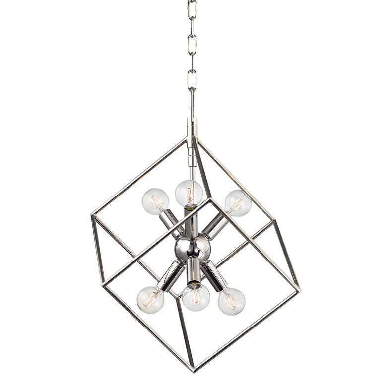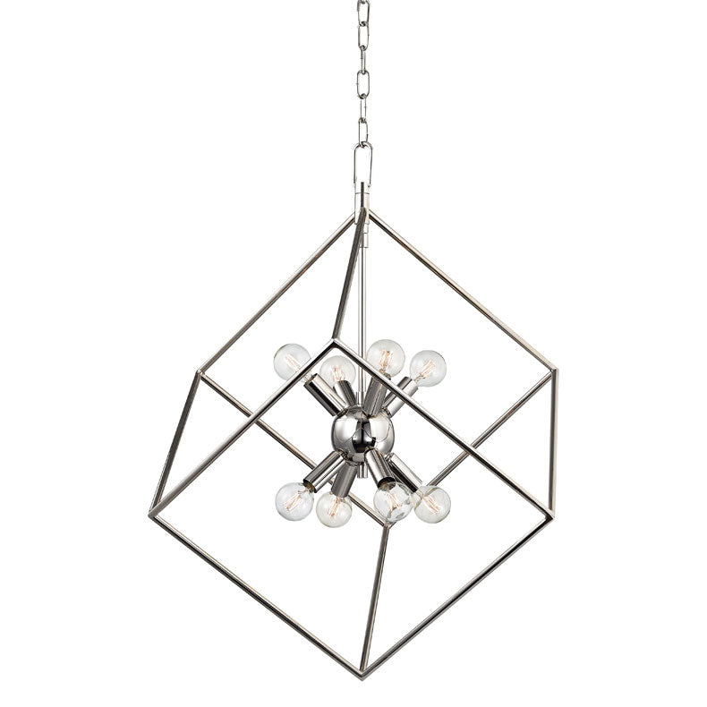 Tumbling cubes overlapped in frozen motion surround a modern-style lighting cluster in this breathtaking fixture. Inert textured black iron contrasts with a metallic finish at core. This chandelier manages to feel utterly contemporary while nodding to the Atomic Age, celebrating the tension that keeps the universe and the atom alike in perfect place.