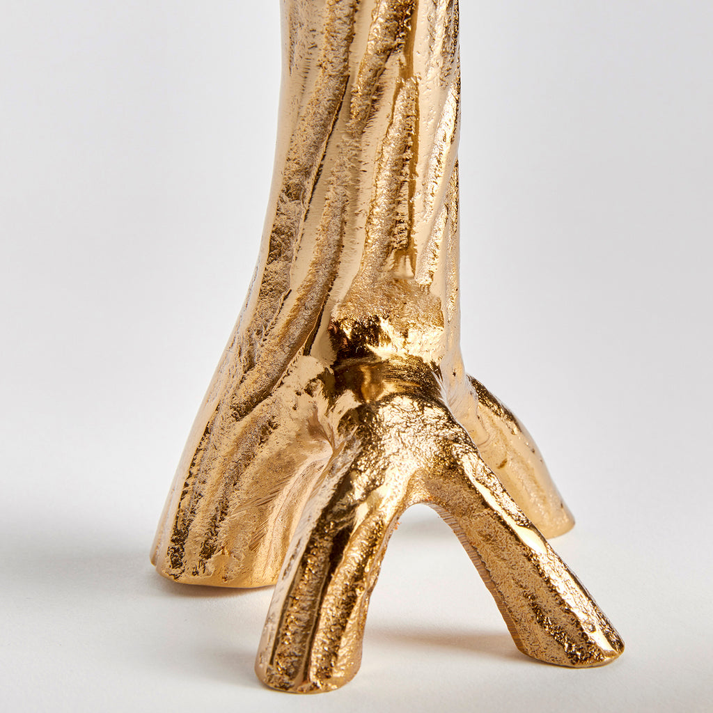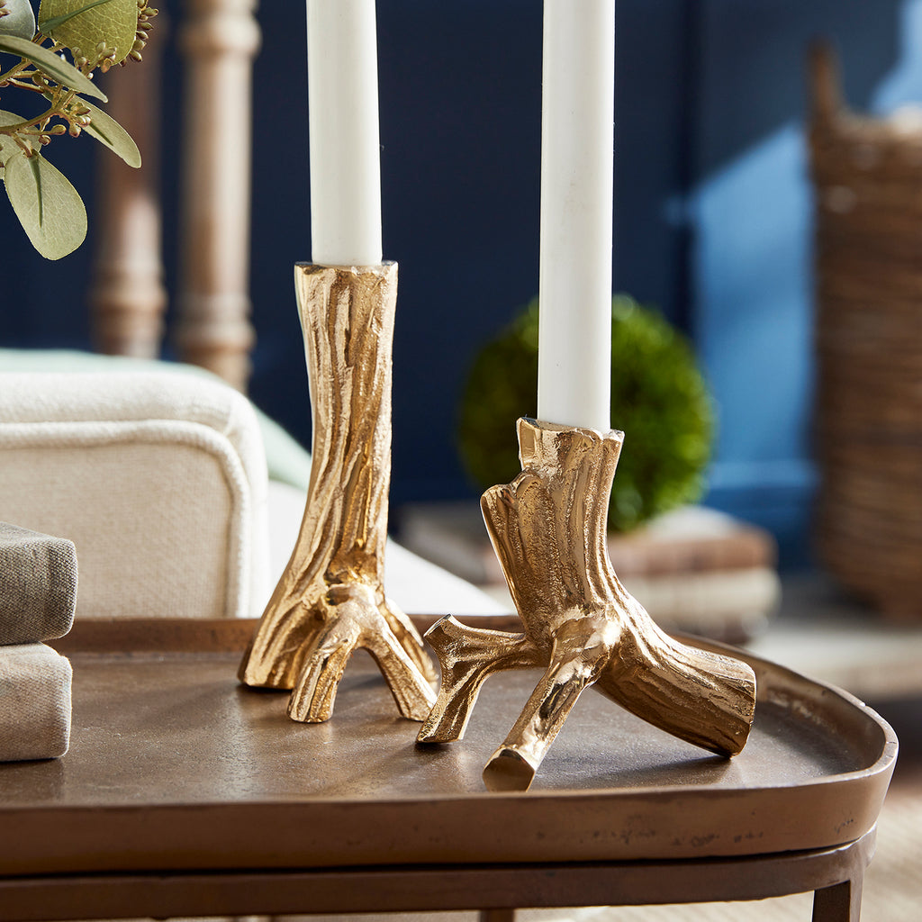Made from hand-sculpted molds and in solid cast aluminum, these taper holders in warm gold are a substantial accent. Pair with any style taper candle and watch them glow.