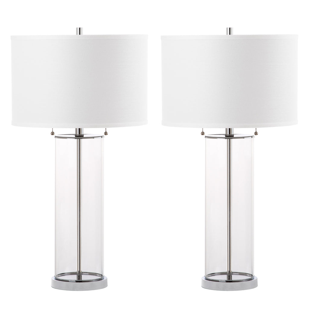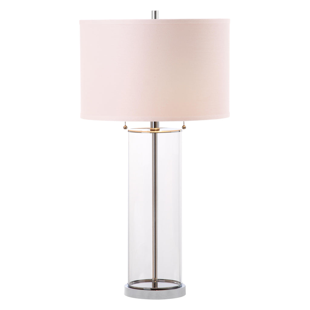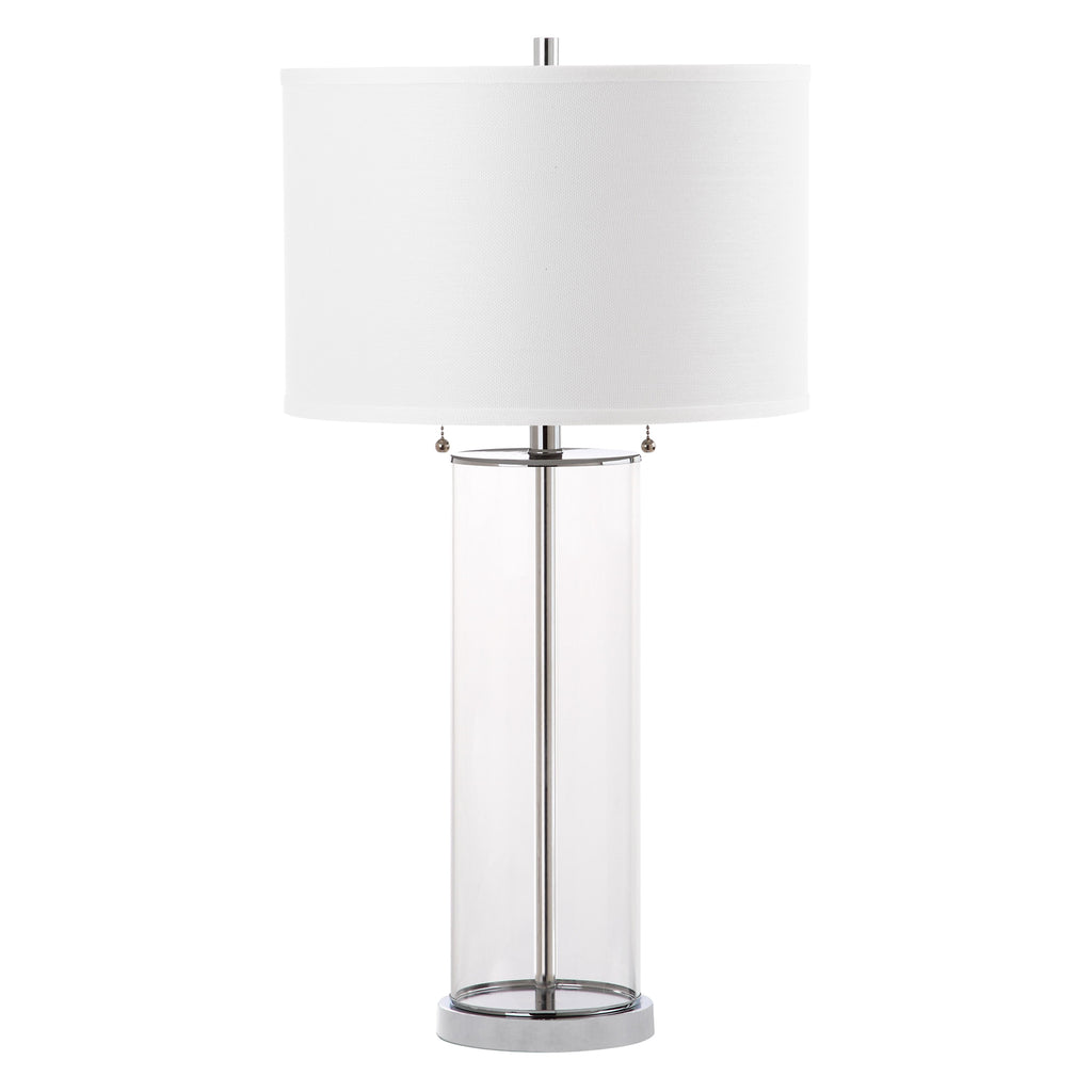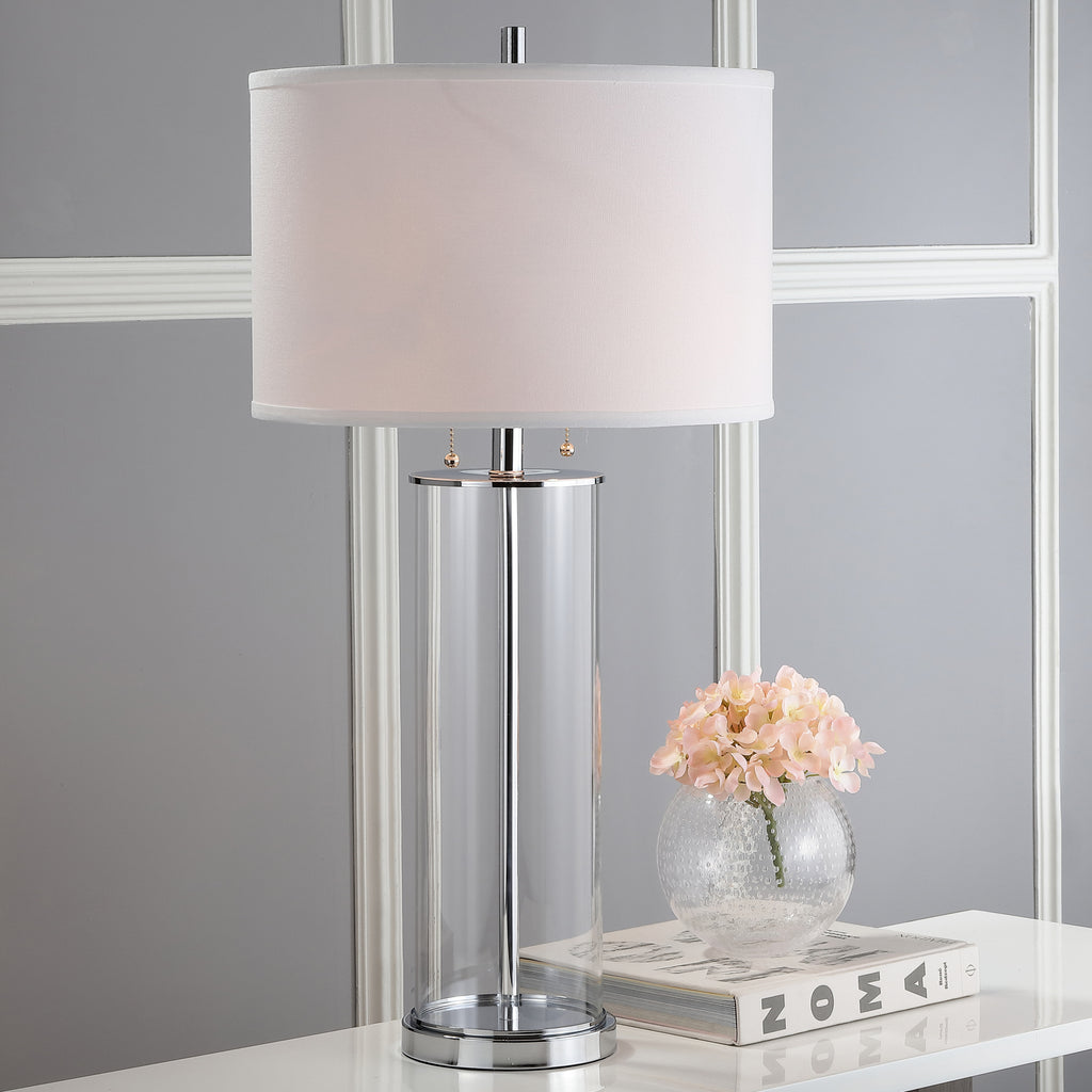 The epitome of style and substance, this clear modern Hyden glass table lamp, offers world-class sophistication. Its contemporary spin on art deco style blends sleek chrome detail with the clean lines of its off-white cotton shade. A modern classic.