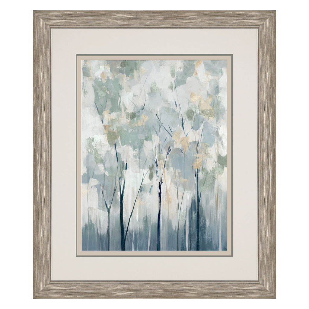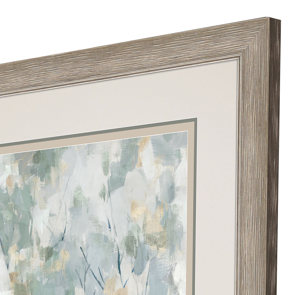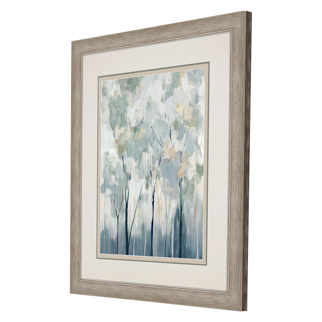 A blue and white forest features neutral matting. Framed in a distressed silver finish moulding.