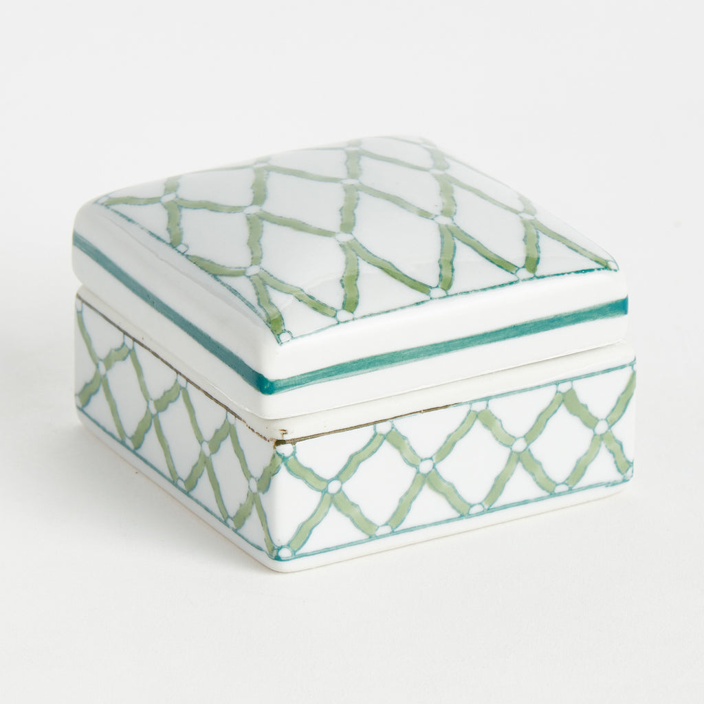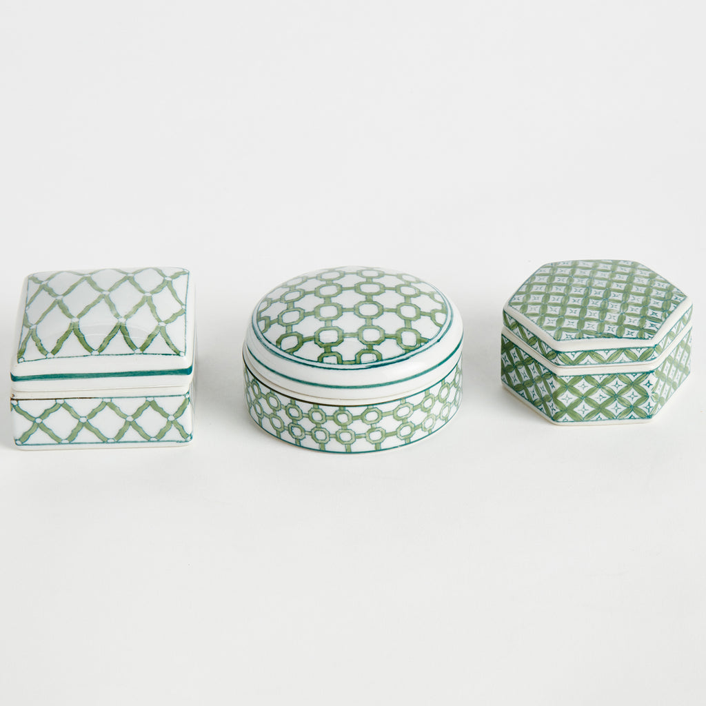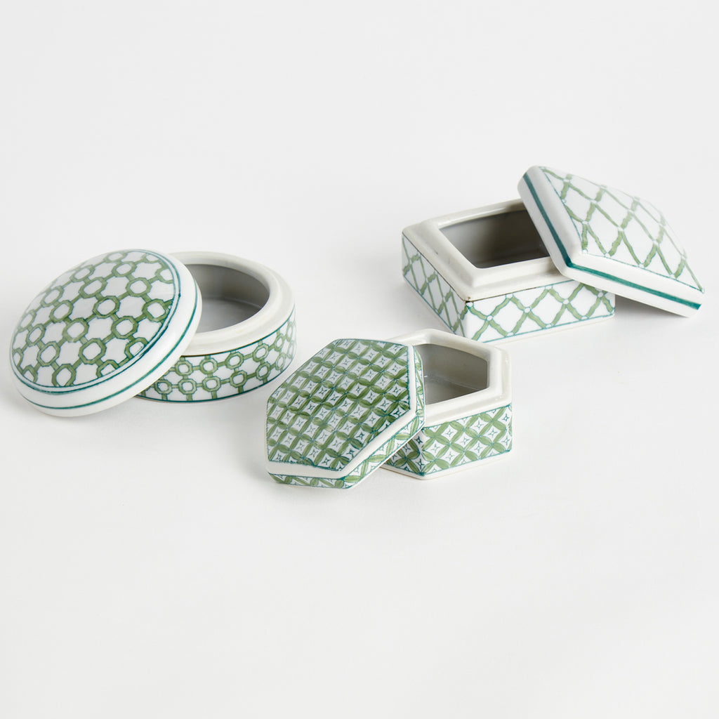 The Imperial Lidded Boxes, Set Of 3 is a decorative home accent designed to elevate your space. Crafted from porcelain, finished in green, white, it brings texture, warmth, and timeless style to any room. A classic chinoiserie in shades of green. How refreshing! The color green is known to have a harmonizing, balancing effect, so is an inspired design choice for the Imperial Lotus Lidded Boxes. A welcome addition, adding stability and calm to the well-appointed bookshelf, mantel or entry console.