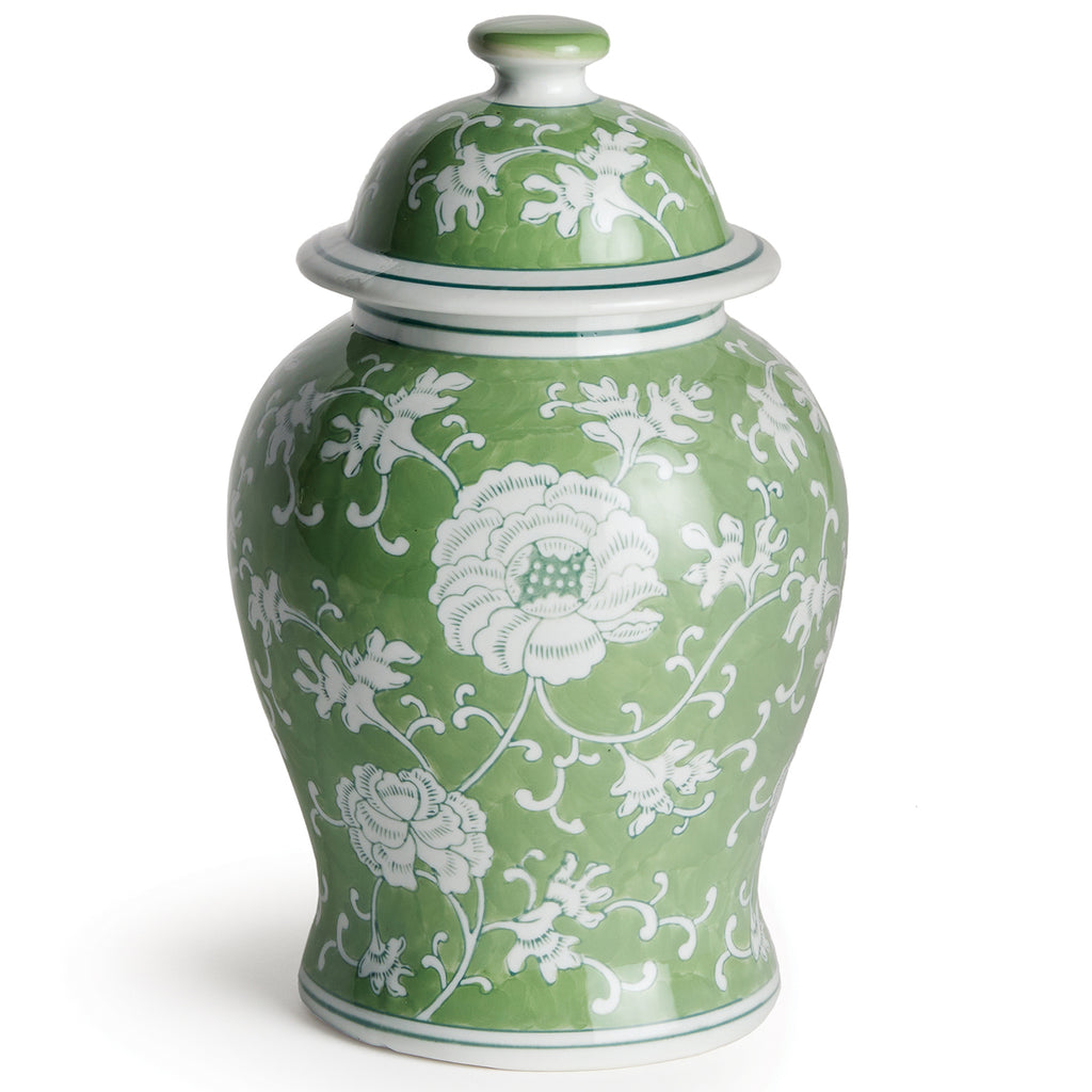 A classic chinoiserie jar in shades of green & white. How refreshing! The color green is known to have a harmonizing, balancing effect, and is an inspired choice for a lidded jar. A welcome addition, adding stability and calm to the well-appointed bookshelf, mantel or entry console.